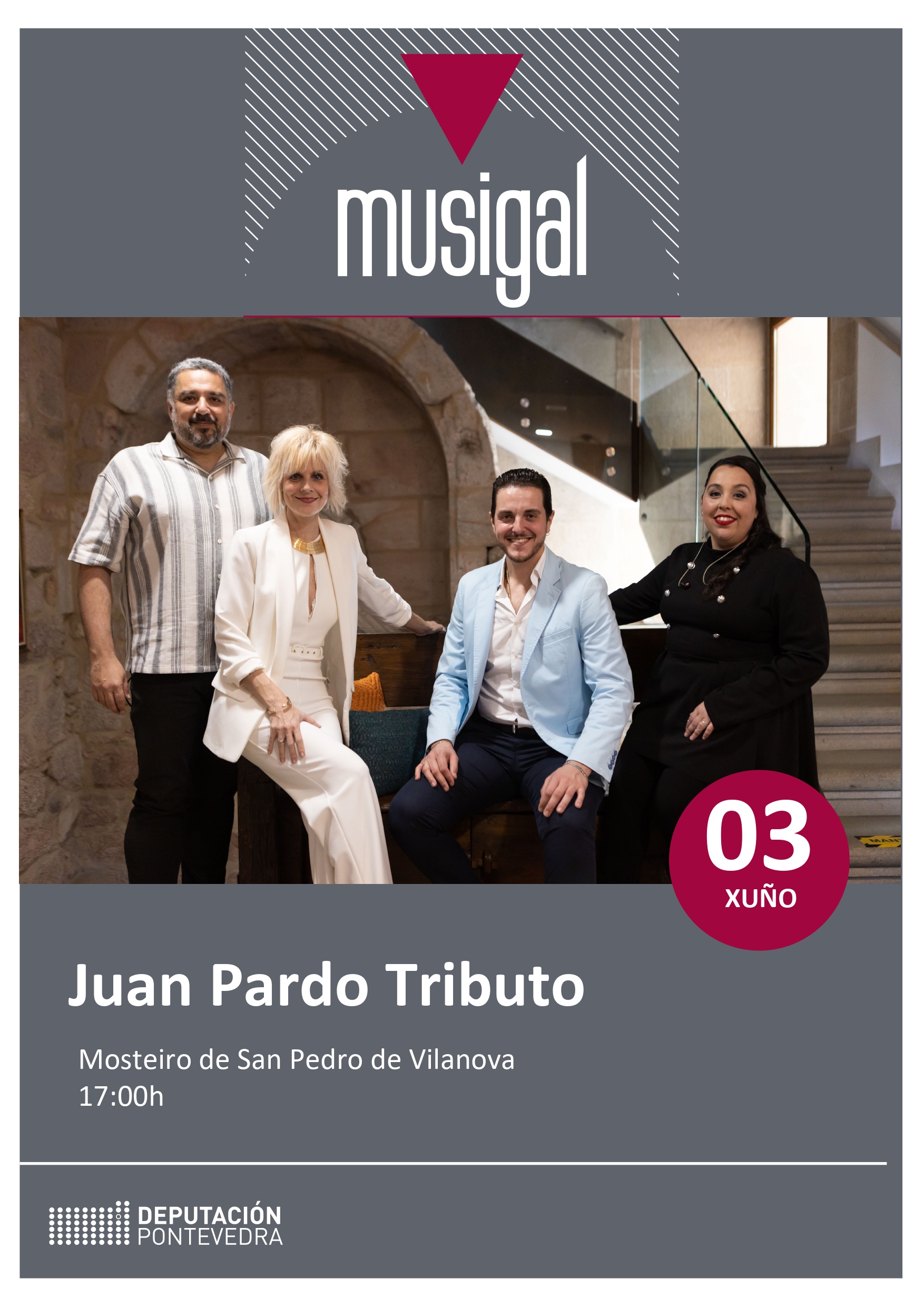 O programa “Musigal” da Deputación continúa enchendo de música a provincia. Nesta ocasión, o Mosteiro de San Pedro de Vilanova, en Dozón, acollerá mañá sábado, ás 17.00 horas, o espectáculo “Juan Pardo Tributo”, no que se recordarán algunhas das súas cancións máis recoñecidas a través da unión de dous artistas consagrados, como Lys Pardo (filla de Juan Pardo) e Fernando Calderón, con dous novos valores do panorama galego, como son Antonio Barros e iAlma. Trátase dun formato que mestura pezas en acústico con arranxos únicos, sempre respectando a esencia da música orixinal do cantautor pero reinterpretados por este cuarteto e a singularidade das súas voces, e no que o 70% do repertorio é en galego.