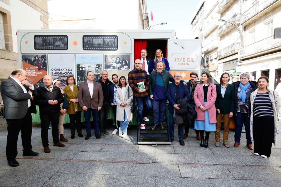 A rúa Príncipe, a poucos metros de distancia de onde José Gil montou no ano 1910 a primeira produtora de cinema da historia de Galicia, converteuse hoxe un século despois no escenario da presentación do proxecto multidisciplinar co que a Deputación, en colaboración con Vía Láctea Films, Cine na Rúa e Editorial Galaxia busca ao longo deste 2023 recoñecer e reivindicar a este visionario e pioneiro, que cimentou as bases do audiovisual galego. Do mesmo xeito que Gil levaba o cine a todos os recunchos de Galicia, un Cinemóbil, esta mañá aparcado ás portas do Museo MARCO, será a peza central coa que este proxecto chegará a 30 concellos cos que este cineasta tivo relación durante a súa vida, e cuxos actuais alcaldes e alcaldesas tamén estiveron hoxe na presentación, amais da presidenta provincial, Carmela Silva, o alcalde de Vigo, Abel Caballero e representantes das citadas entidades, Ignacio Vilar, Carlos Méndez, Lucía Concepción, Manuel González e Francisco Castro.
