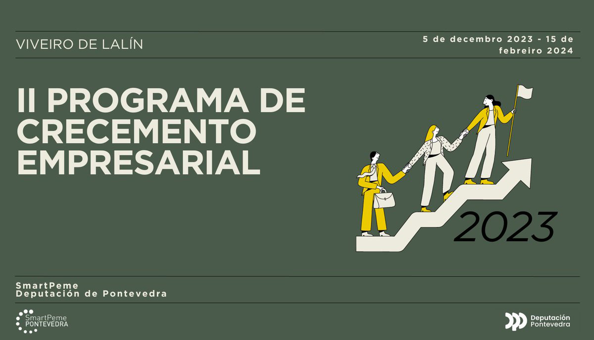 O Programa de crecemento empresarial da Deputación arranca este martes no Viveiro de Empresas do Polígono Industrial Lalín 2000 coa participación de seis proxectos emprendedores vinculados aos concellos da Estrada, Lalín e Silleda. Trátase de iniciativas empresariais en fase inicial e de consolidación centradas na economía social, na alimentación, na comunicación, no benestar de mascotas e na organización de xuntanzas e de obradoiros dirixidos a mulleres rurais. A partir deste martes e ata o 15 de febreiro de 2024 as persoas participantes recibirán un completo programa formativo que AS axudará a lanzar ou consolidar os seus proxectos emprendedores.