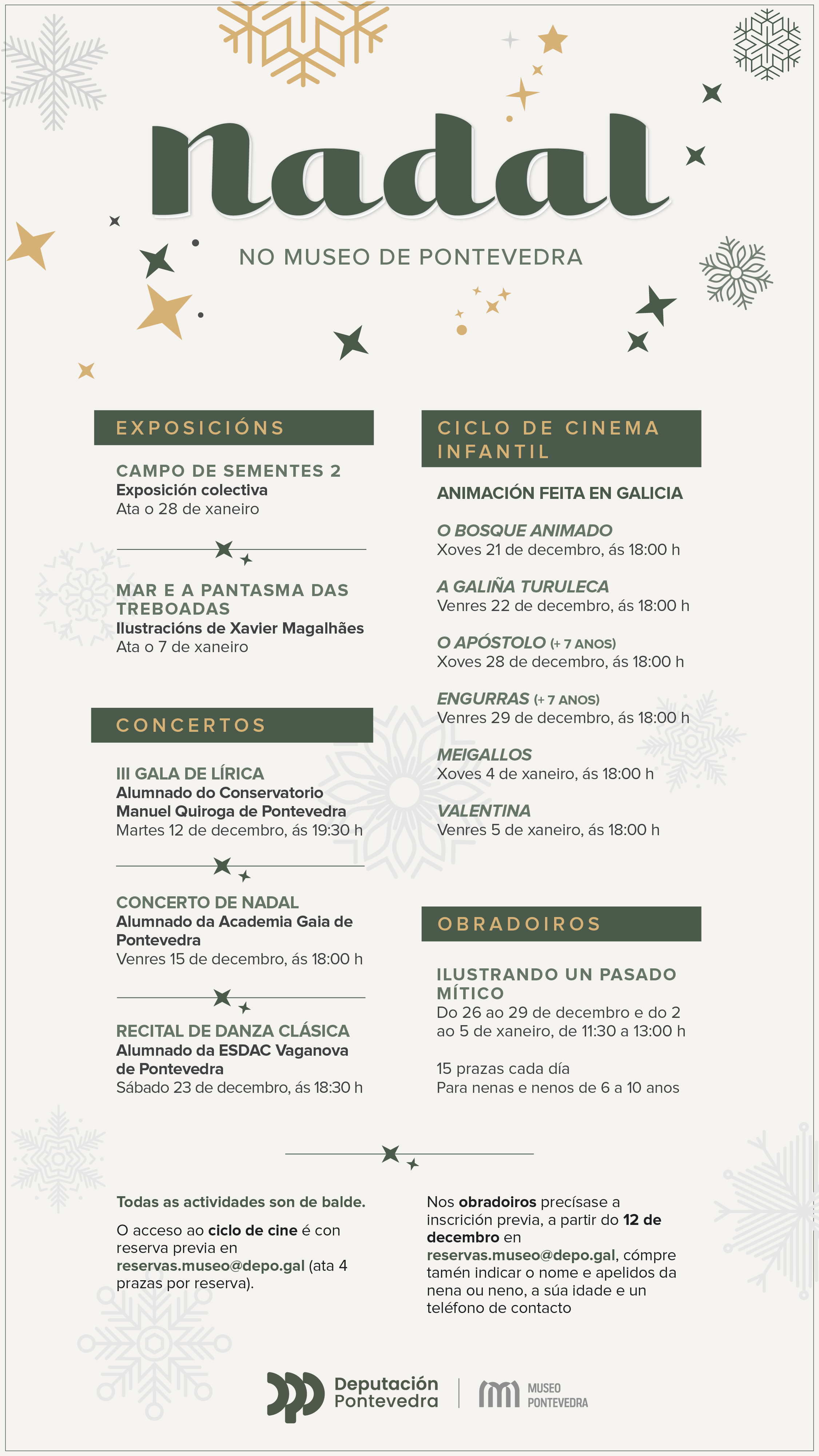 A programación de Nadal do Museo de Pontevedra comeza este martes coa Gala de Lírica do alumnado do Conservatorio Manuel Quiroga. Seguirano outros concertos e recitais, un ciclo de cine infantil con seis longametraxes de animación galega e un obradoiro de ilustración con quendas diarias nas semanas centrais do Nadal, ademais de dúas exposicións abertas nestas datas no Edificio Castelao. A isto únese a edición dunha postal de Nadal que poderán recoller as persoas que visiten o Museo nestas datas.
