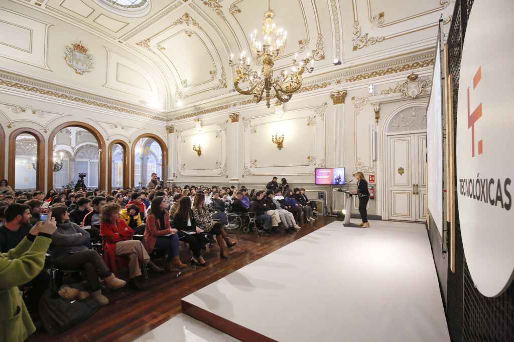 Carmela Silva lembrou que “Tecnolóxicas” nace da preocupación da Deputación e ASIME, por unha banda, ante a enorme demanda de perfís profesionais técnicos e a escasa oferta e, pola outra, do baixo número de matriculación de mulleres nestas especialidades. “Preocúpanos porque cando analizamos o que acontece na educación obrigatoria vemos que as nenas son moi boas en matemáticas pero non escollen esas carreiras senón outras ligadas ao coidado, que son fundamentais –educación, sanidade, recursos humanos…– pero que tamén se van prestar a través de novas tecnoloxías como a intelixencia artificial”. A presidenta animou as rapazas “a matricularvos nas carreiras tecnolóxicas e que ninguén vos poña límites, xa que case todos son impalpables”. Tamén lembrou que “se sempre nos din que o noso son os coidados non reparamos en que temos esta opción, pero témola. As mulleres podemos e debemos estar en todo”.