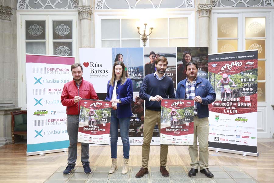 Todo está xa preparado para a esperada cita que do 6 ao 8 de maio subirá á provincia de Pontevedra ao podio do motociclismo internacional, a estrea do Mundial de Enduro GP 2022 en Lalín, unha competición que reunirá a un centenar das e dos mellores pilotos desta dura especialidade, procedentes de 17 países. O deputado provincial de Deportes, Gorka Gómez, presentou a cita no Pazo Provincial acompañado da deputada de Igualdade Victoria Alonso e do presidente da Federación Galega de Motociclismo, Jose Canda, subliñando a importancia deste evento, única proba do Mundial que se celebrará en España, e que prevé que se acheguen milleiros de persoas ao territorio.