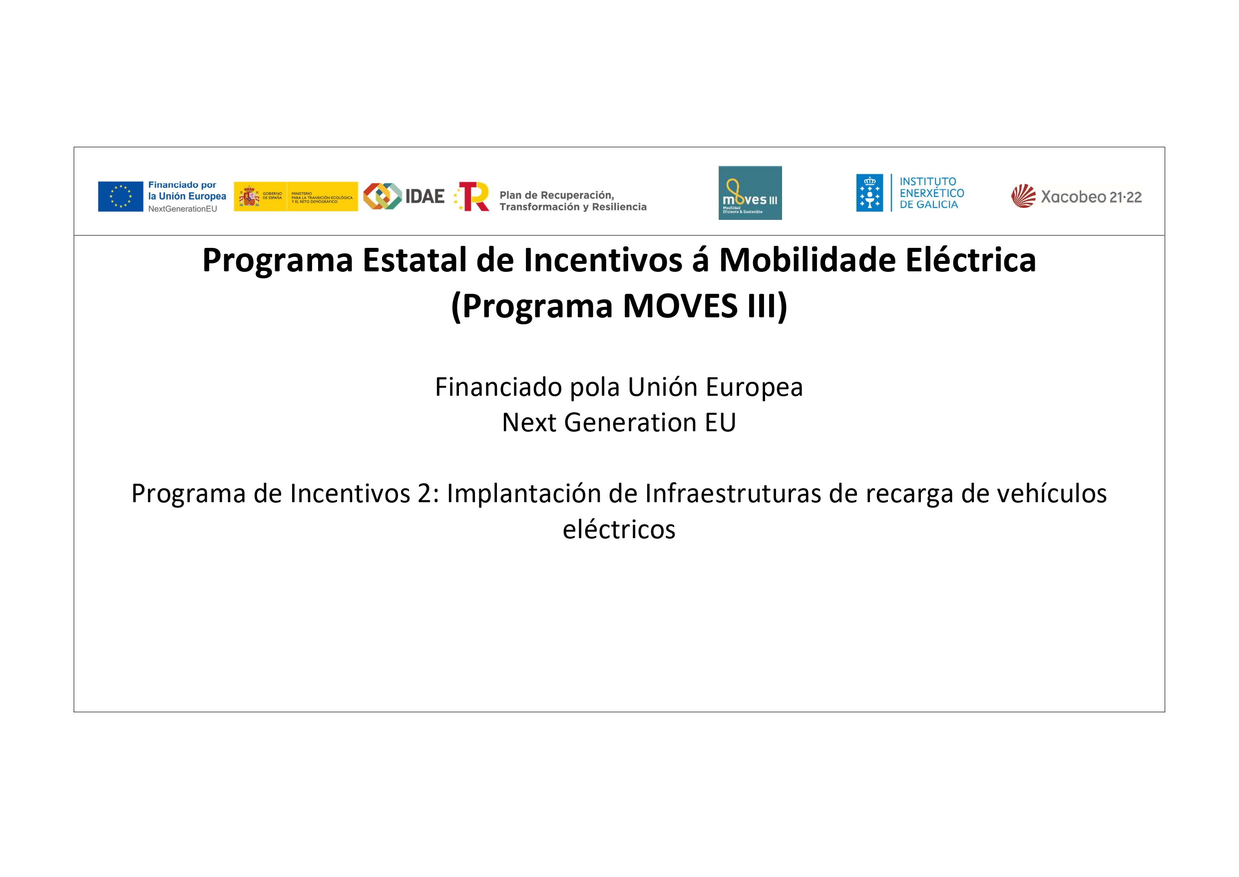 A tal efecto, en la Resolución de 26 de julio de 2021, de la Agencia Instituto de Energía de Galicia (INEGA), se aprueba la convocatoria del procedimiento de subvención correspondiente al Programa estatal de incentivos a la movilidad eléctrica (MOVES III), modificada por la Resolución de 21 de octubre de 2021 y por la Resolución de 23 de diciembre de 2021, cuyo programa de incentivo 2 está dedicado a desplegar la infraestructura de recarga de vehículos eléctricos.