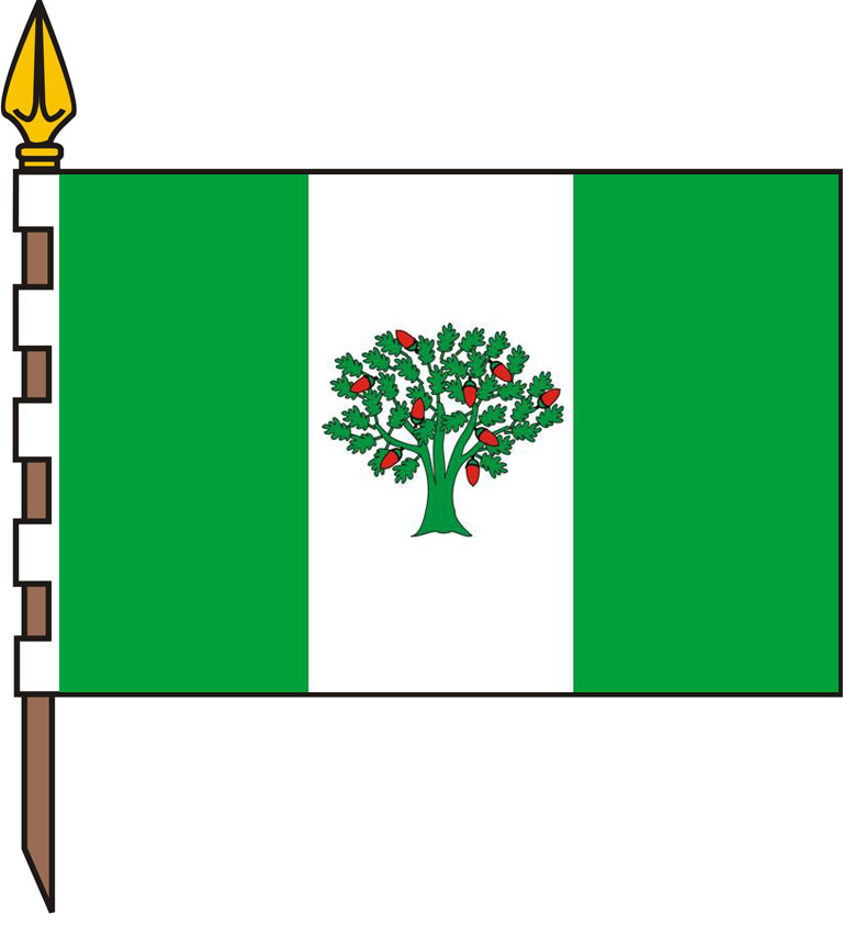 Decreto 169/2008, del 17 de julio DOG núm. 159 (19 de agosto de 2008). Paño con tres franjas horizontales de blanco, verde y blanco, con la verde del doble de tamaño que las otras con trece círculos de amarillo puestos, uno en el centro y doce en los vértices de dos imaginarios hexágonos concéntricos. Las franjas blancas, a su vez, con sendas franjas horizontales de azul.