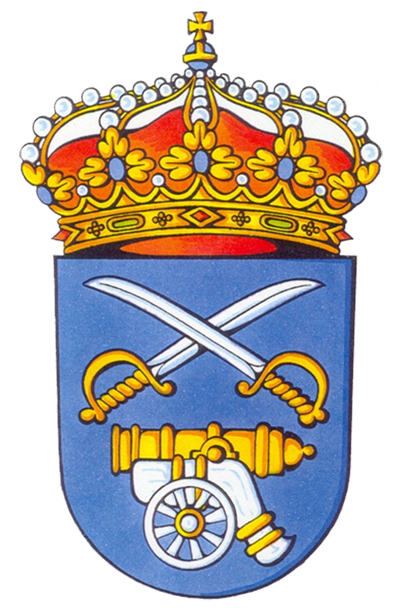 De azul (azur) el cañón de oro (amarillo), con el carro y ruedas de plata, surmontado por dos sables de caballería de plata (blanco), guarnecido de oro y dispuesto en aspa. Al timbre, corona real cerrada.