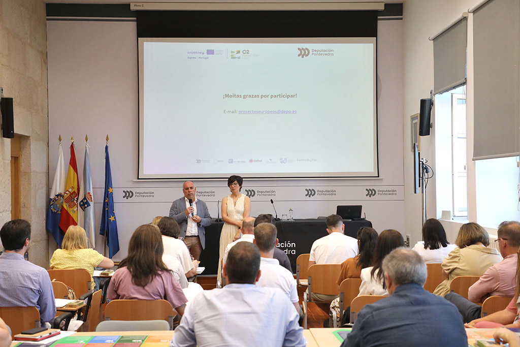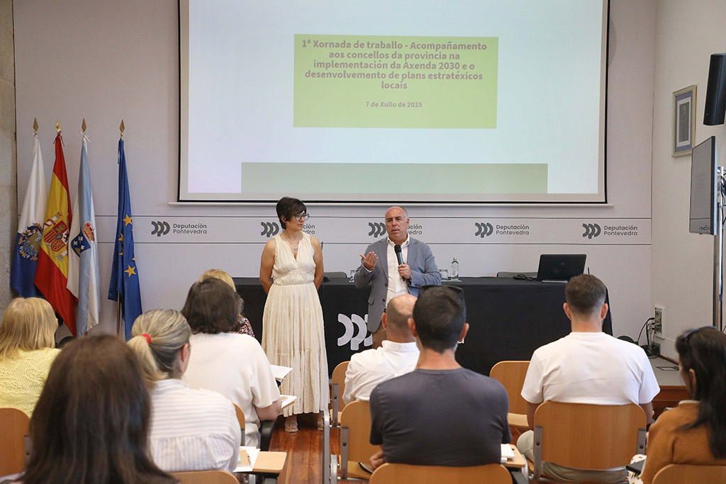 A Deputación de Pontevedra organizou este luns no Edificio Administrativo da institución provincial a primeira xornada de traballo no marco co proxecto europeo C2 Axenda 2030 local, co obxectivo de impulsar a implementación dos Obxectivos de Desenvolvemento Sostible e plans estratéxicos locais nos concellos de menos de 10.000 habitantes da provincia de Pontevedra. O deputado provincial de Fondos Europeos, Javier Tourís, deu a benvida ao encontro enmarcado neste proxecto que está a liderar a Deputación e no que tamén participan a Universidade de Vigo, as deputacións de Cáceres e Huelva e, desde Portugal, as Comunidades Intermunicipais do Alto Minho, o Baixo Alentexo e a Beira Baixa.