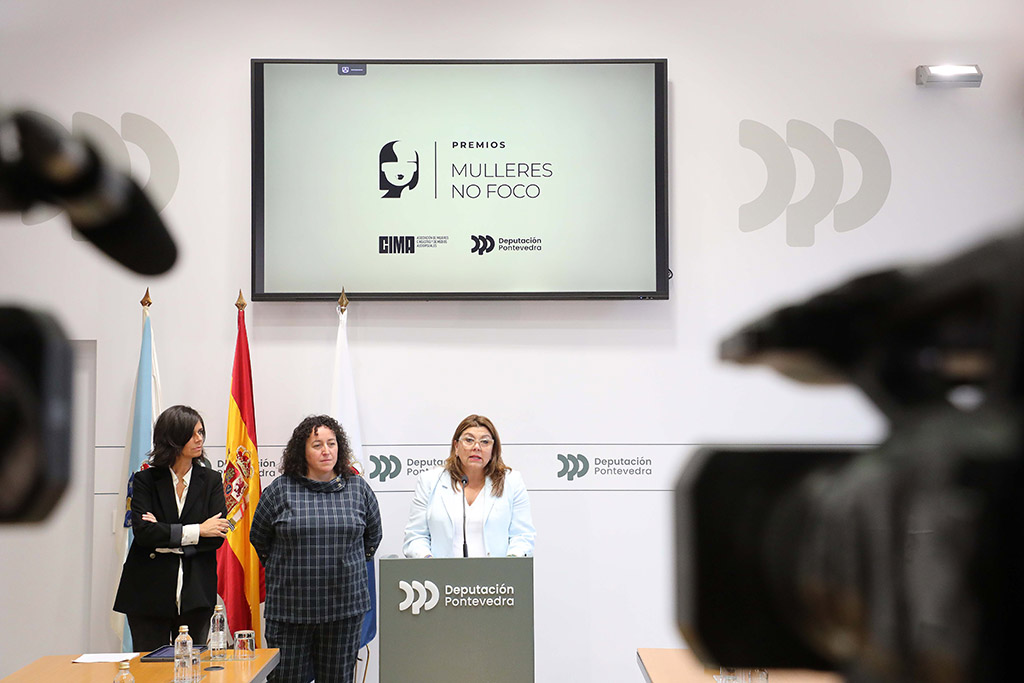 . A deputada de Igualdade Sandra Bastos, xunto con Nati Juncal, delegada de CIMA en Galicia, e Elena García Román, delegada adxunta, presentou a nova edición dos premios Mulleres no Foco, promovidos pola Deputación de Pontevedra en colaboración coa Asociación de Mulleres Cineastas e de Medios Audiovisuais (CIMA). Trátanse duns galardóns que teñen por obxectivo, tal e como explicou a deputada de Igualdade, “incentivar, apoiar e recoñecer a traxectoria e papel das profesionais galegas do audiovisual e facer que cheguen ao conxunto da sociedade”.