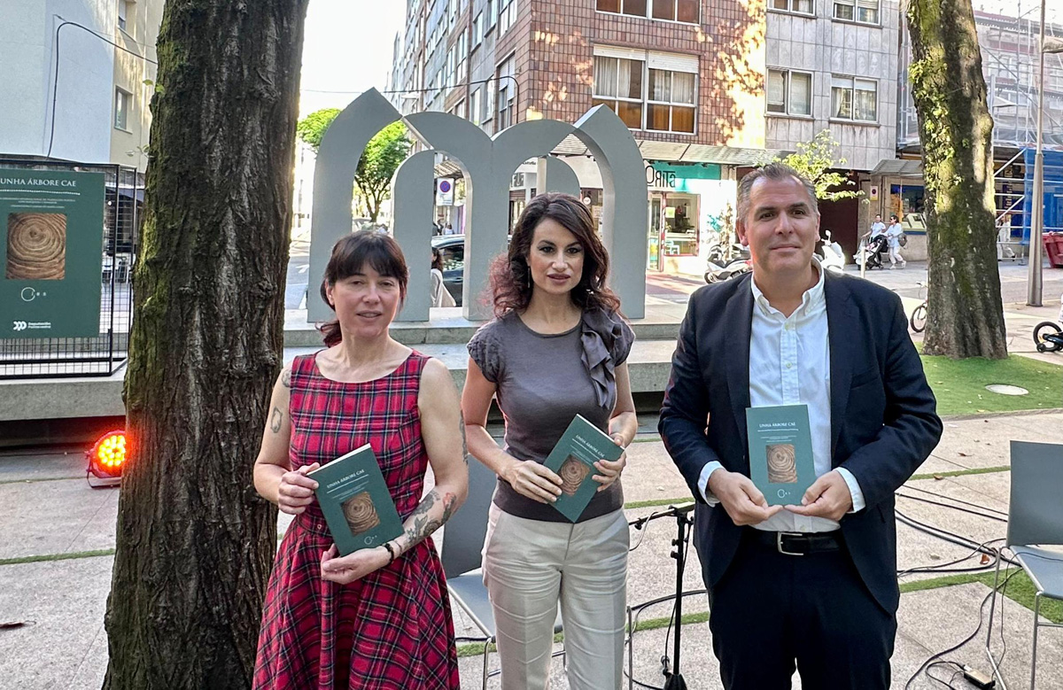 O vicepresidente da Deputación de Pontevedra, Rafa Domínguez, acaba de presentar no Edificio Castelao do Museo de Pontevedra “Unha árbore cae”, a publicación editada pola institución provincial que recolle os froitos da décima edición do Obradoiro Internacional de Tradución Poética “Con Barqueira e Remador”. Domínguez, que estivo acompañada por Yolanda Castaño, coordinadora da colección, e María Lado, autora do libro, remarcou o “enorme pracer” de colaborar anualmente con esta iniciativa e subliñou a aposta prioritaria da institución provincial pola cultura: “Somos conscientes da súa potencialidade e da importancia que ten desde o público apoiar o talento e a creatividade da nosa provincia”.