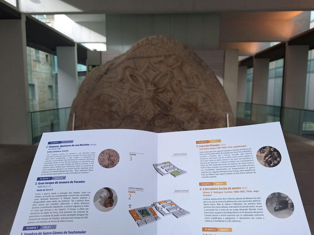 A Deputación acaba de incorporar unha nova guía temática en papel para as persoas que visitan o Museo de Pontevedra por libre. Trátase do folleto ‘Volver a ser humanos: arte, guerra e esperanza’, que propón un percorrido pola exposición permanente no que, a través de 12 obras expostas nos edificios Castelao e Sarmiento, as e os visitantes se poden aproximar á temática da 32ª. Bienal de Pontevedra, centrada na guerra e a súa superación a través da empatía.