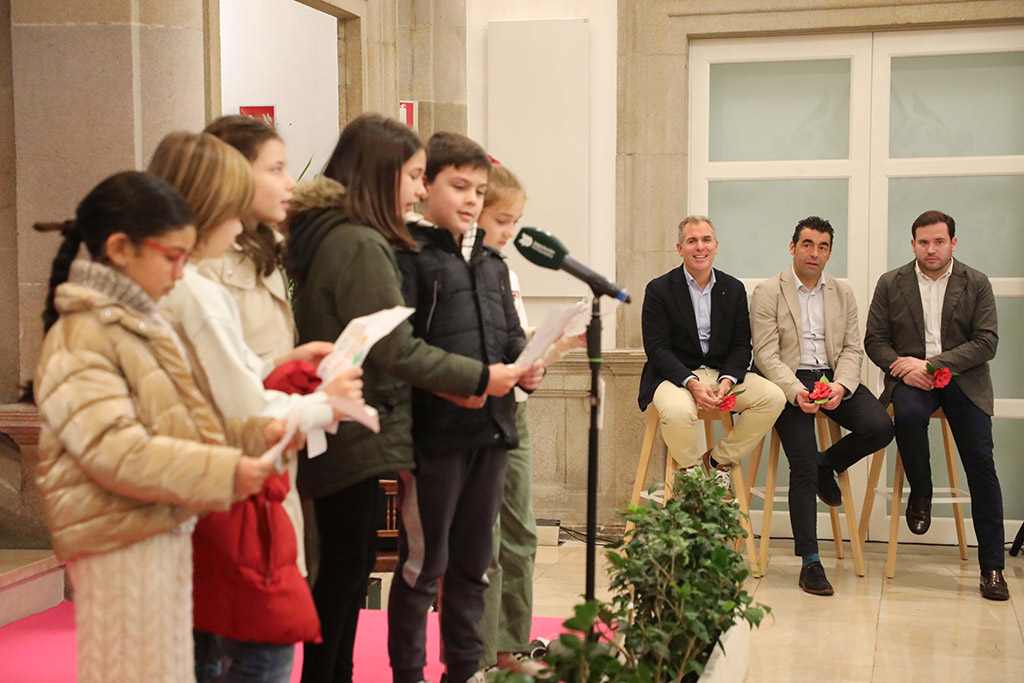 O presidente da Deputación de Pontevedra, Luis López, convida a toda a cidadanía da provincia a facer uso da lingua galega con motivo da conmemoración do Día de Rosalía de Castro e do Día Internacional das Linguas Maternas. Dúas datas sinaladas que a administración provincial celebrou coa organización dun acto con alumnas e alumnos de terceiro de Primaria do CEIP Campolongo, de Pontevedra, que recitaron poemas da autora galega e desfrutaron do espectáculo infantil “Buscando a Rosalía” a cargo da narradora Raquel Queizás. Acompañado polo vicepresidente Rafa Domínguez e o deputado de Cultura, Jorge Cubela; o presidente Luis López aproveitou o encontro cos estudantes para recitarlles unha estrofa do poemario Cantares Gallegos e convidar tanto ao alumnado como ao conxunto da poboación a “que coidemos, promovamos e utilicemos o galego. Esa é a invitación que vos quero facer desde a Deputación”.
