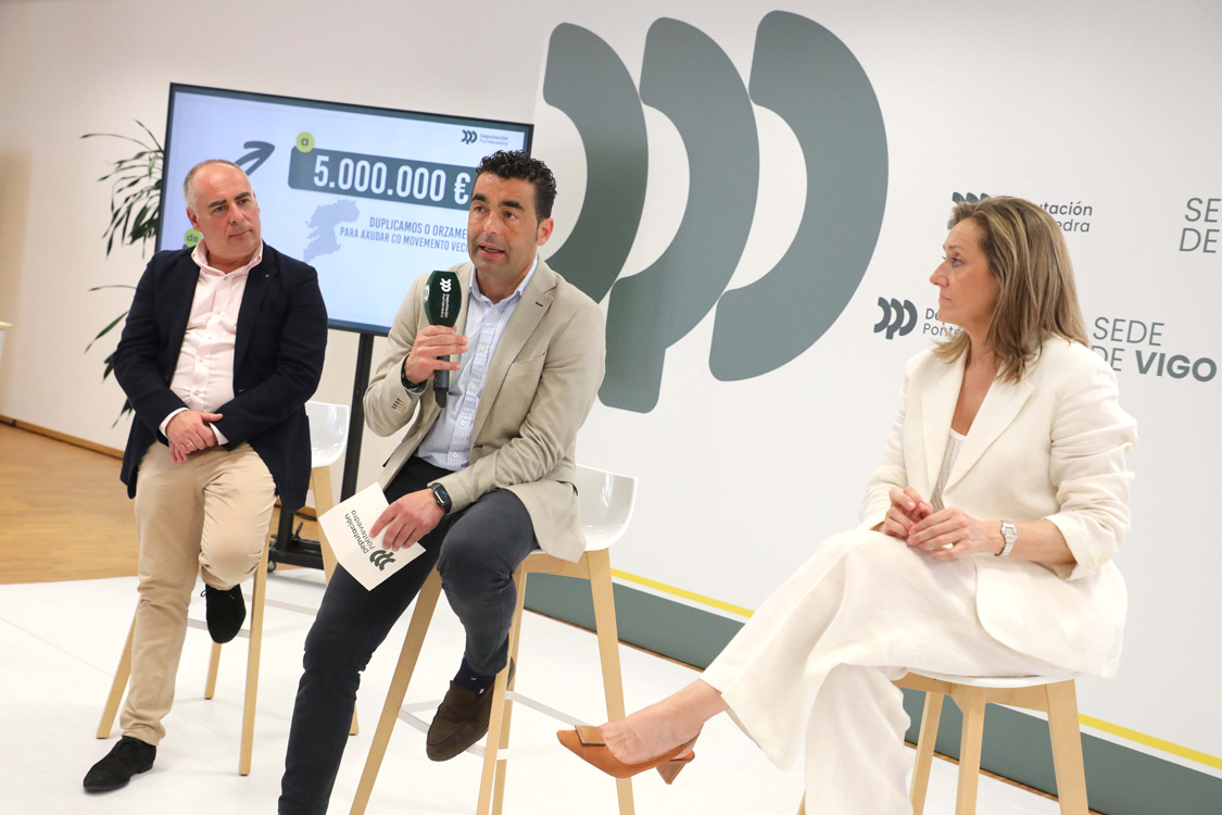 O presidente da Deputación de Pontevedra, Luis López, anuncia un incremento dos programas de Acción Comunitaria —Provincia Comunitaria, +Aqua e Novaqua— ata os 5 millóns de euros a través dunha modificación orzamentaria que o organismo provincial aprobará no vindeiro pleno do 30 de maio. Acompañado pola vicepresidente Luisa Sánchez e o deputado Javier Tourís nun encontro con representantes do movemento veciñal na Sede de Vigo da Deputación, o dirixente reforza o compromiso do goberno provincial coas entidades veciñais cun esforzo investidor sen precedentes no eido da cooperación co tecido asociativo que busca atender case a totalidade das solicitudes presentadas a estes tres programas. "Está a ser tal o volume de solicitudes que recibimos, que lonxe de conformarnos cos extraordinarios resultados acadados, multiplicamos a nosa aposta polo movemento veciñal. Compráceme enormemente anunciar hoxe que a Deputación de Pontevedra vai incrementar os recursos destinados ás entidades veciñais ata a cifra histórica de 5M€ este ano: máis do dobre do orzamentado inicialmente", adiantou o presidente da Deputación.