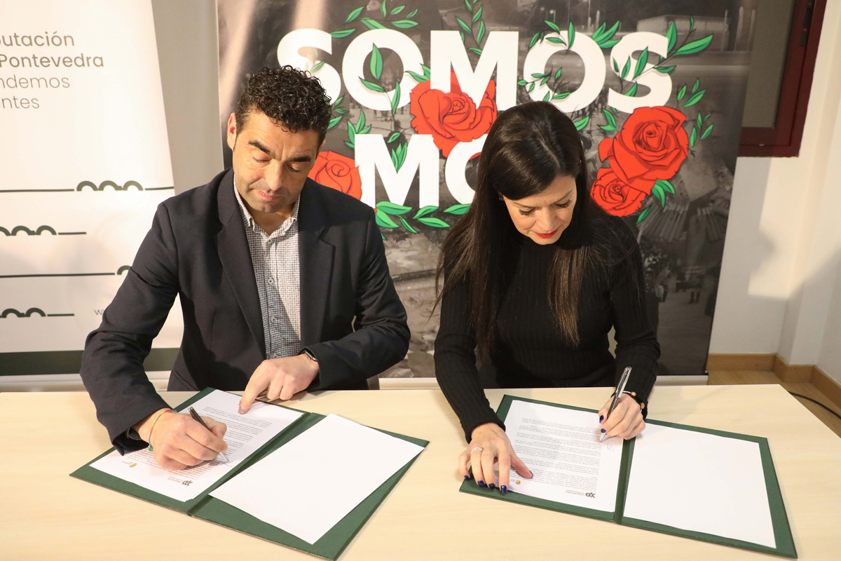 O presidente da Deputación, acompañado pola deputada de Infraestruturas, Isabel Couselo, asina coa alcaldesa de Mos, Nidia Arévalo, un convenio para construír unha senda peonil e mellorar a seguridade viaria nun treito de 1.350 metros