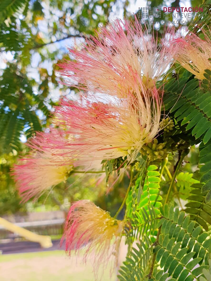 Flor: agrúpanse en inflorescencias máis ou menos globosas, carecen de pétalos e destacan polos seus estames longos e abundantes de cor rosa, que lle dan un aspecto plumoso ou sedoso