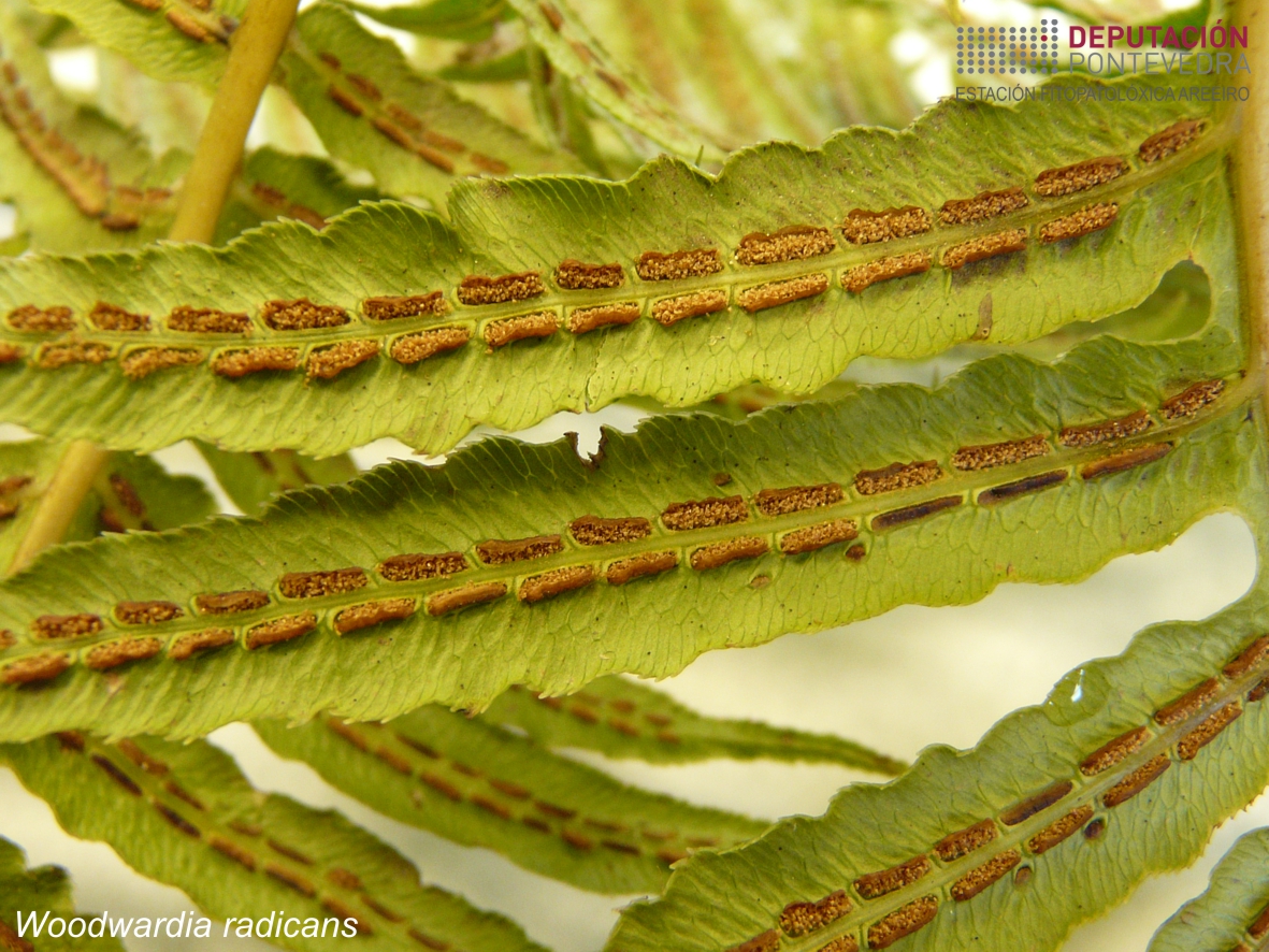 Outros datos: Soros: situados no envés da fronde, oblongos, de cor marrón, protexidos por un indusio convexo e coriáceo, dispostos en dúas filas paralelas a ambos os lados do nervio central das pínnulas, coma se fosen un pespunte, tan remarcado que o seu debuxo se aprecia claramente na parte superior da fronde.