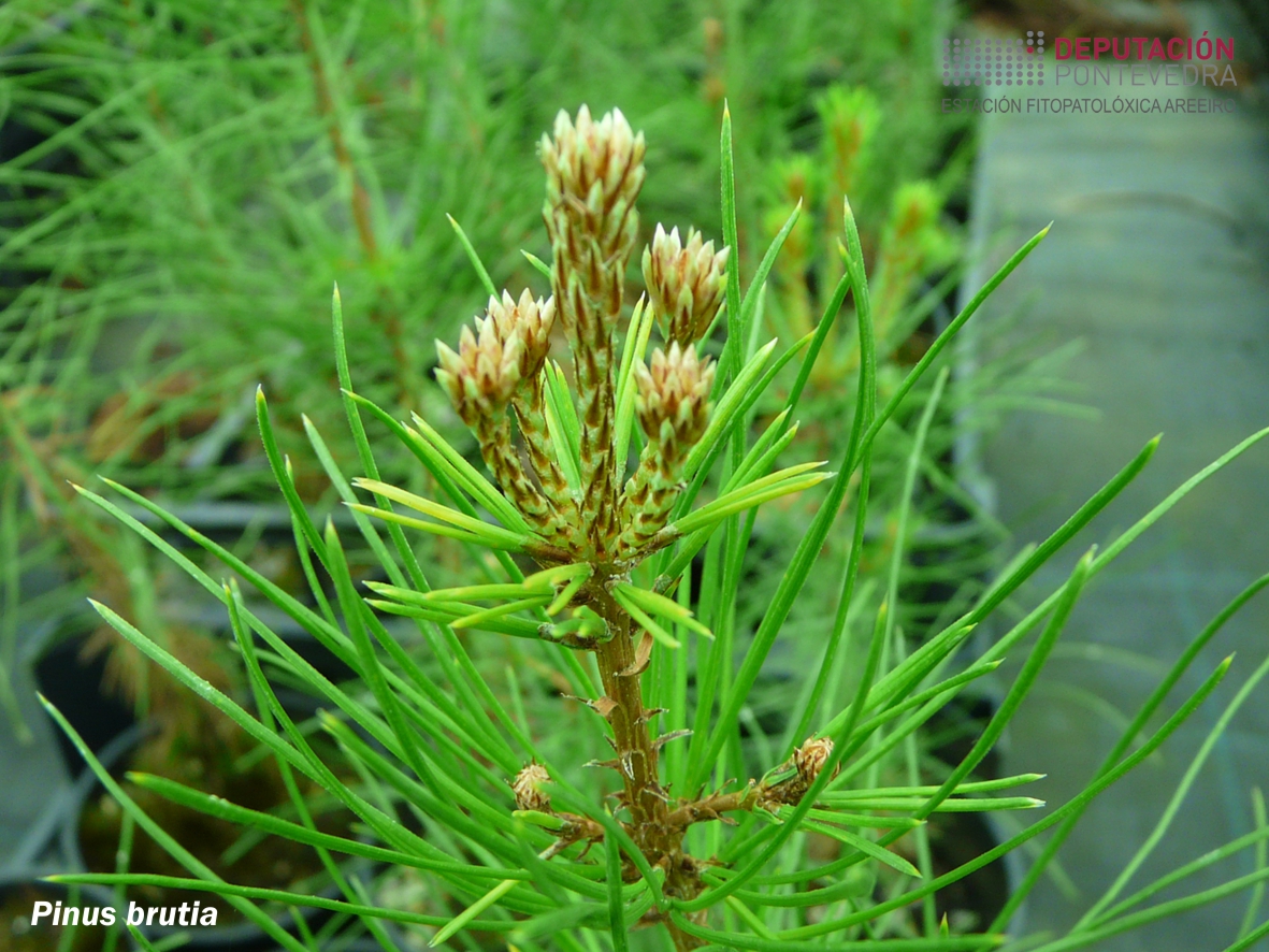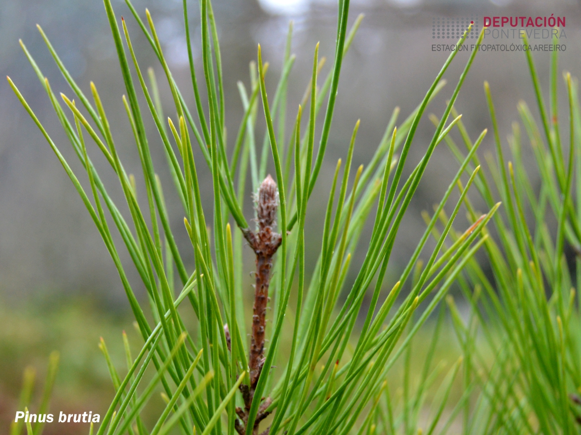Follas: aciculares, dispostas en grupos de dous, de 10 a 16 cm de lonxitude e de 1 a 1,5 mm de grosor, de cor verde clara