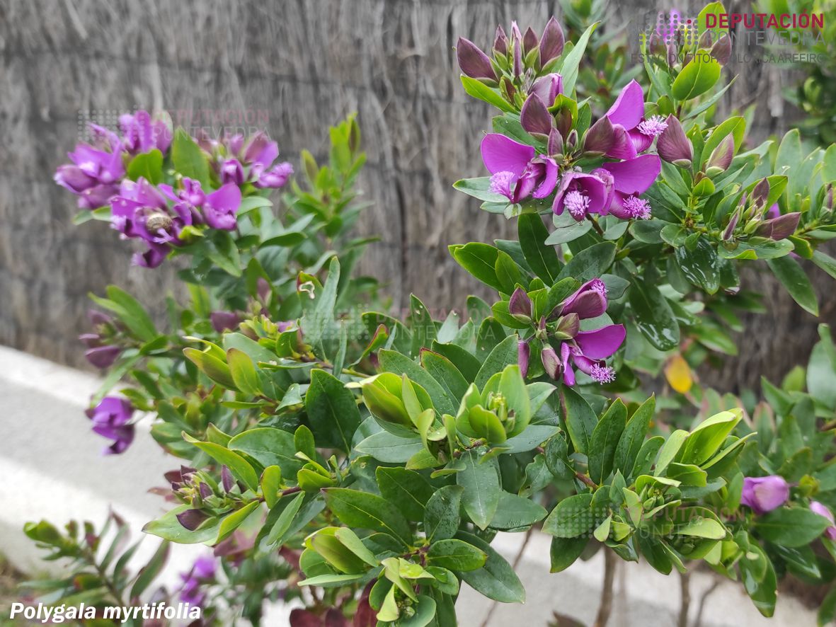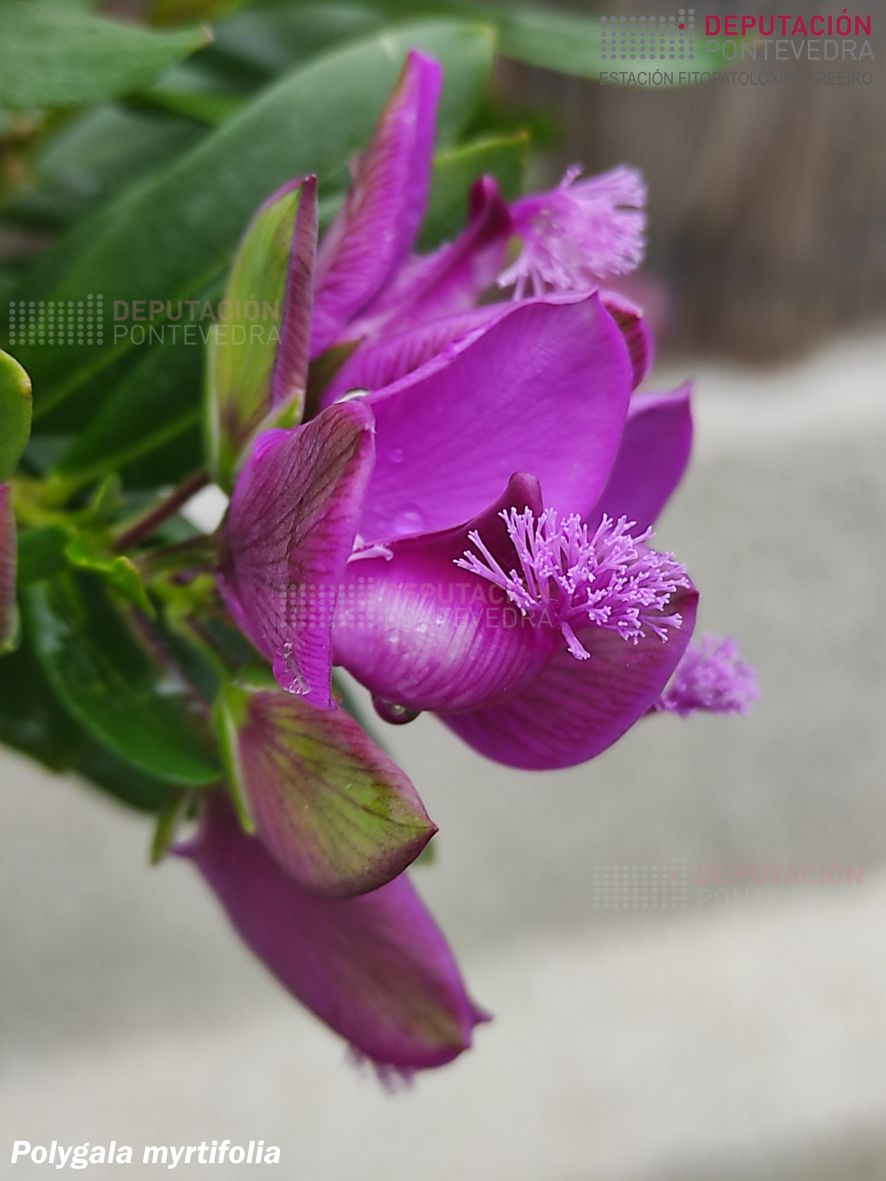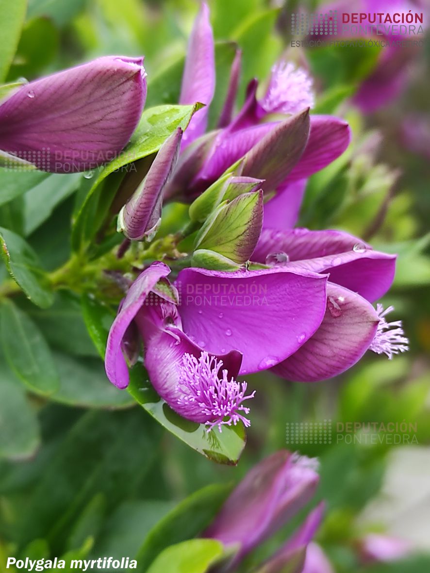 Flores: agrupadas en inflorescencias nos extremos dos brotes, de cor malva ou púrpura, con dous pétalos unidos que forman un ángulo aberto e semellan as ás dunha bolboreta, e un rechamante penacho de estames de cor máis clara. Floración de longa duración que en climas suaves pode prolongarse durante case todo o ano, aínda que a máxima produción coincide coa primavera.