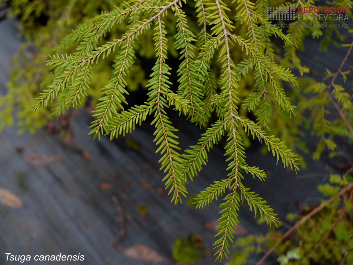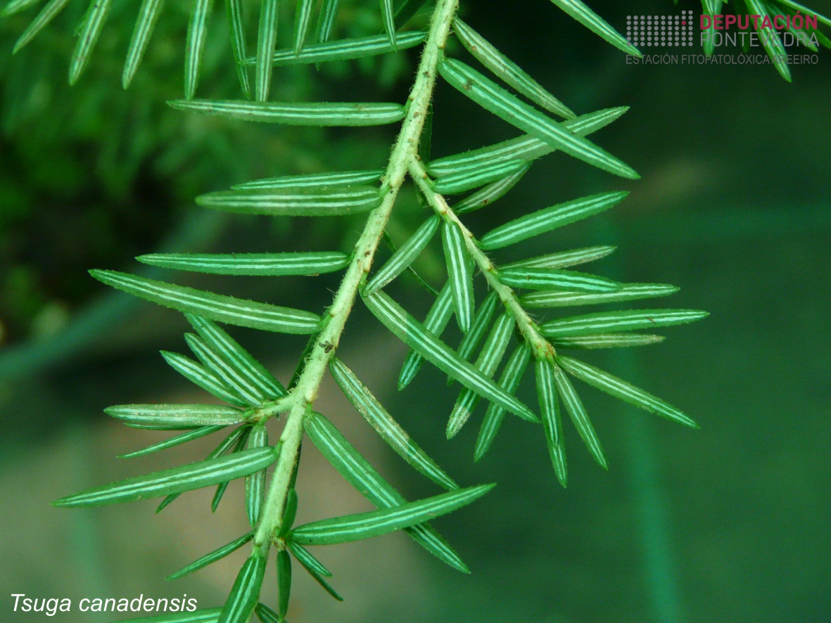 Follas: aciculares, aplanadas, pecioladas co bordo finamente denticulado e co ápice redondeado. Son de cor verde na parte superior e presentan dúas bandas brancas no envés
