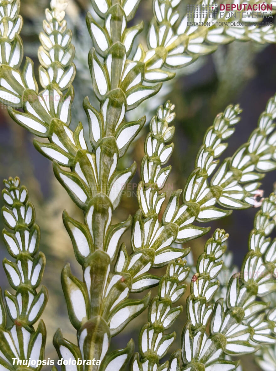 Follas: escamiformes, dispostas en catro filas, co feixe de cor verde escura brillante e co envés branco.