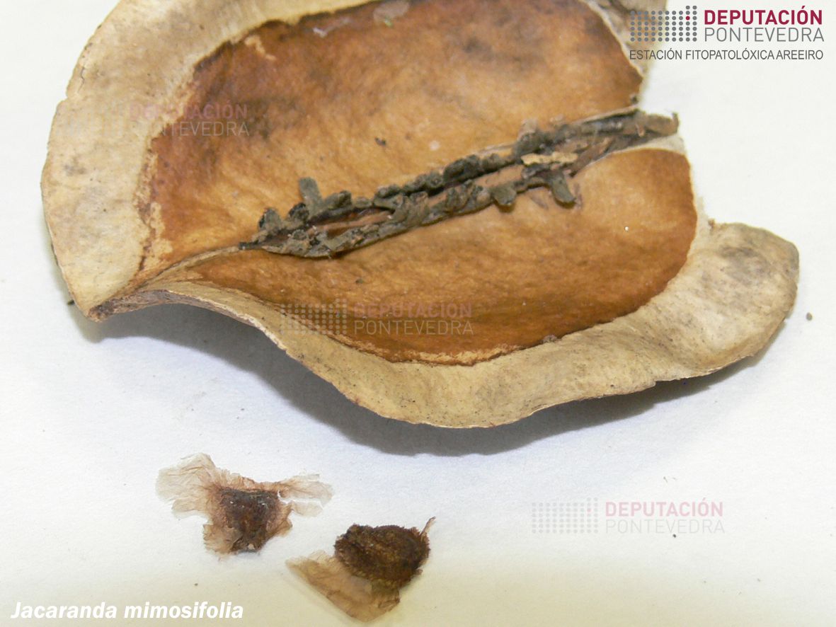 Froito: cápsula leñosa pedunculada, redondeada e comprimida, case plana; permanece durante todo o ano na árbore.