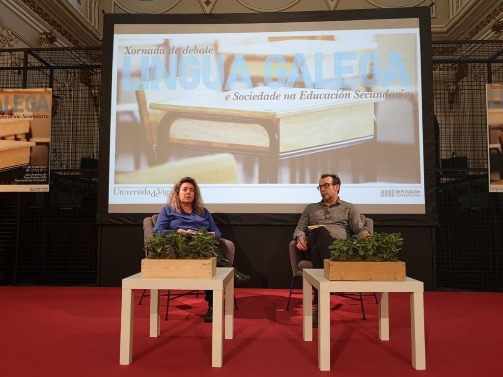 Definir ferramentas e propostas que permitan mellorar o ensino da situación sociolingüística do galego nas aulas de Secundaria e contribuír a que o alumnado comprenda a situación de minoración na que se atopa o idioma son dous dos obxectivos do proxecto ‘Lingua e sociedade’ -que impulsa a Deputación de Pontevedra xunto a persoal investigador da Universidade de Vigo- e que hoxe centraron as xornadas homónimas celebradas no Pazo Provincial. Un dos resultados do traballo será a publicación dunha guía didáctica que se repartirá nos centros da provincia.