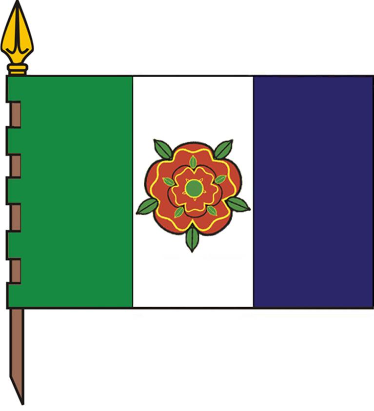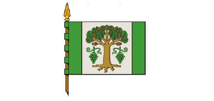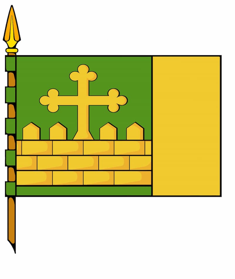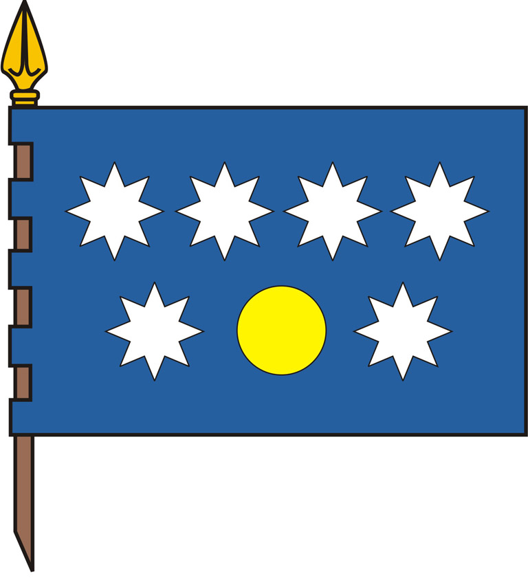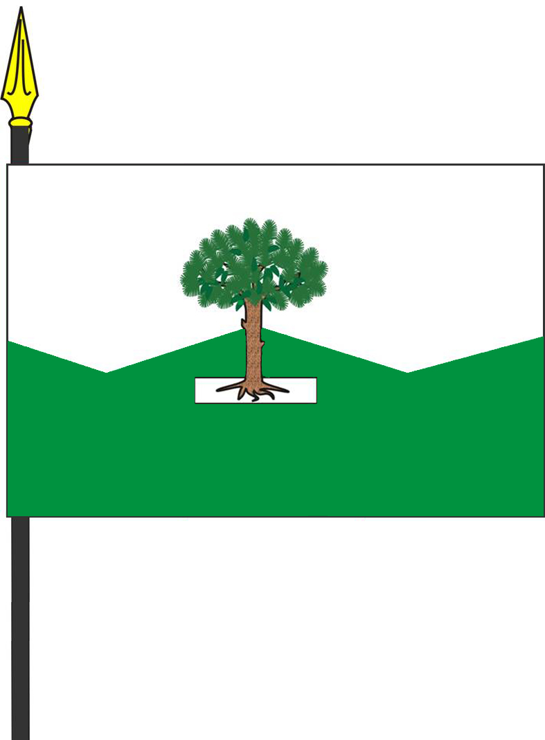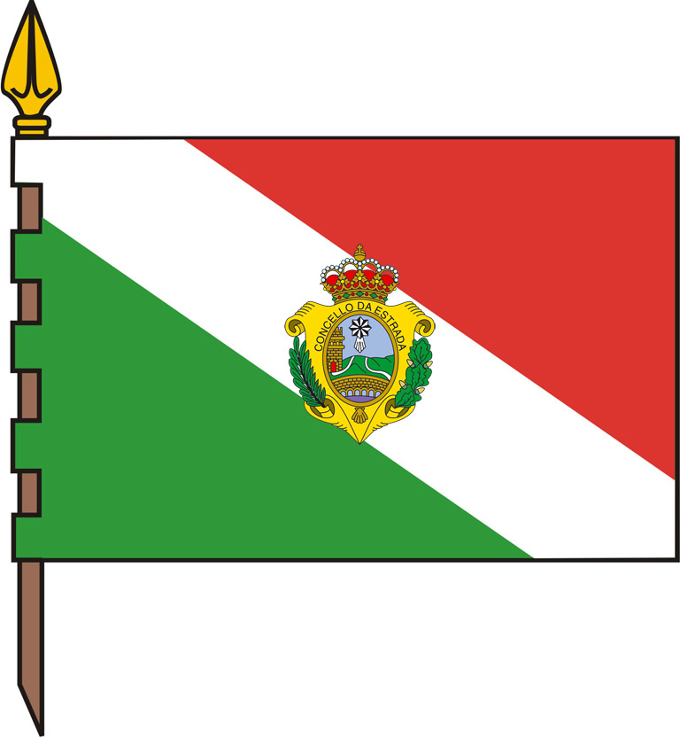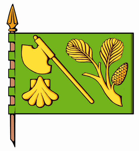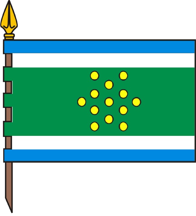 Decreto 169/2008, do 17 de xullo DOG núm. 159 (19 de agosto de 2008). Pano con tres franxas horizontais de branco, verde e branco, coa a verde do dobre de tamaño con trece círculos de amarelo postos, un no centro e doce nos vértices de dous imaxinarios hexágonos concéntricos. As franxas brancas, pola súa vez, con sendas franxas horizontais de azul.