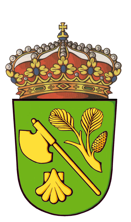 De sinople (verde), unha machada de ouro (amarelo), disposta en banda e acompañada, no xefe, dunha rama de piñeiro e, na punta, dunha vieira, todo do mesmo. Ao timbre, coroa real pechada.