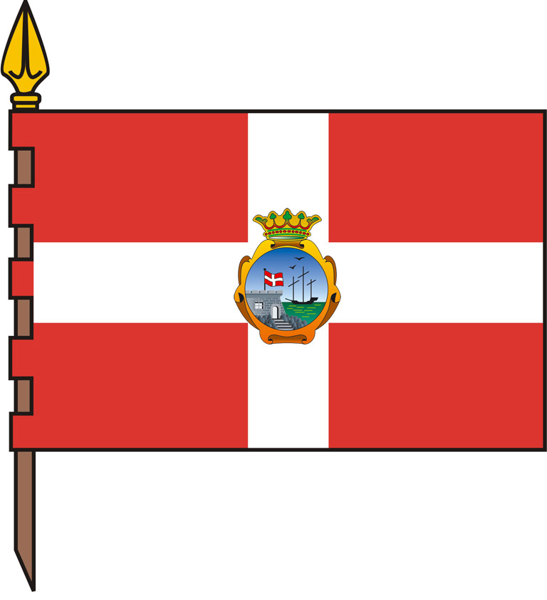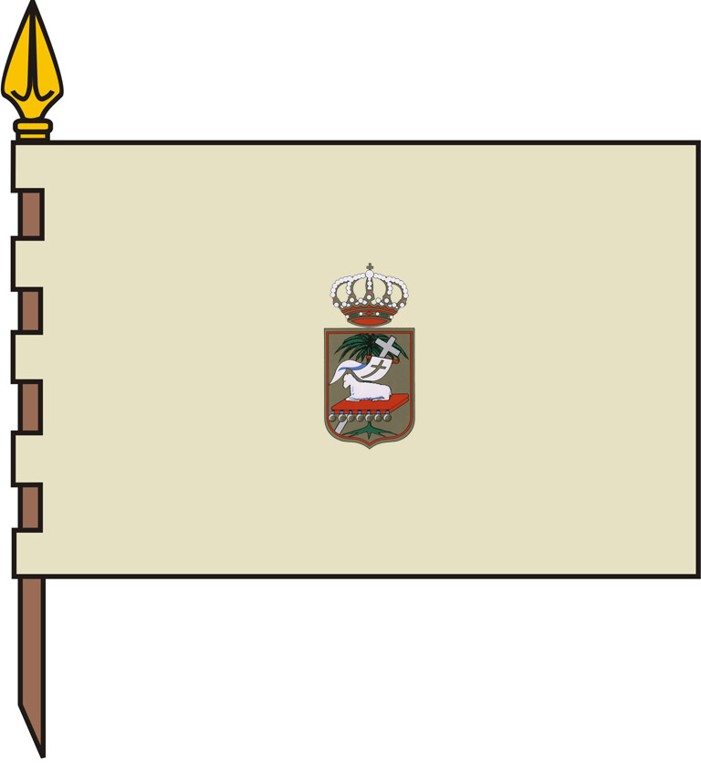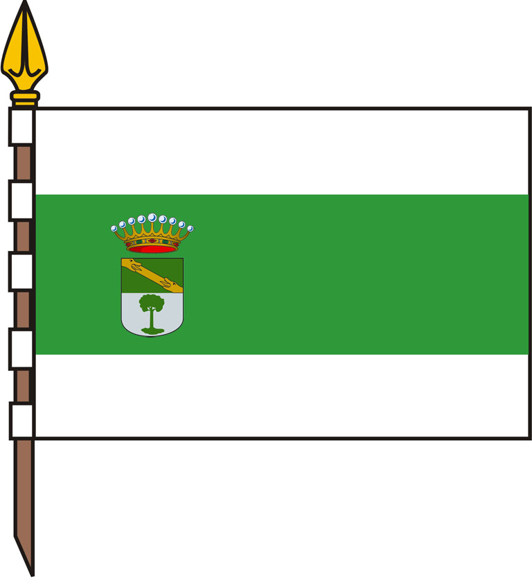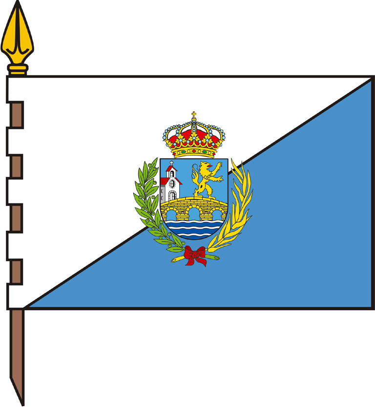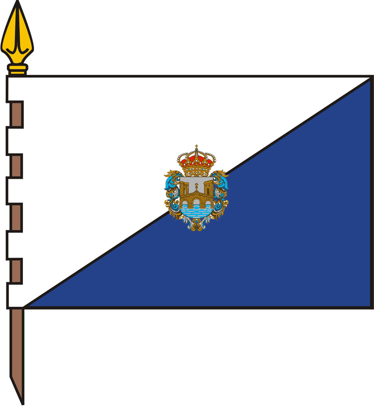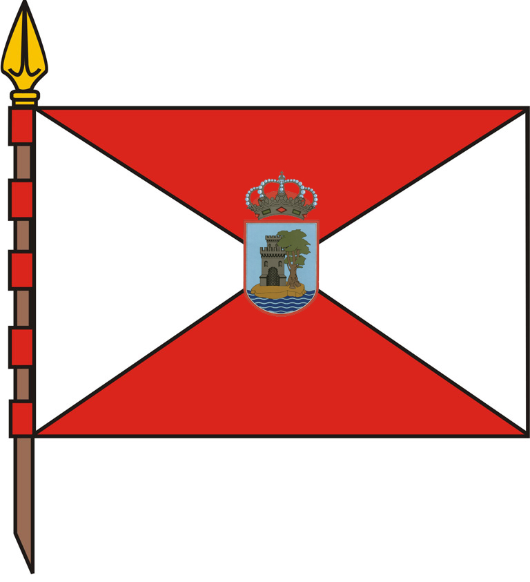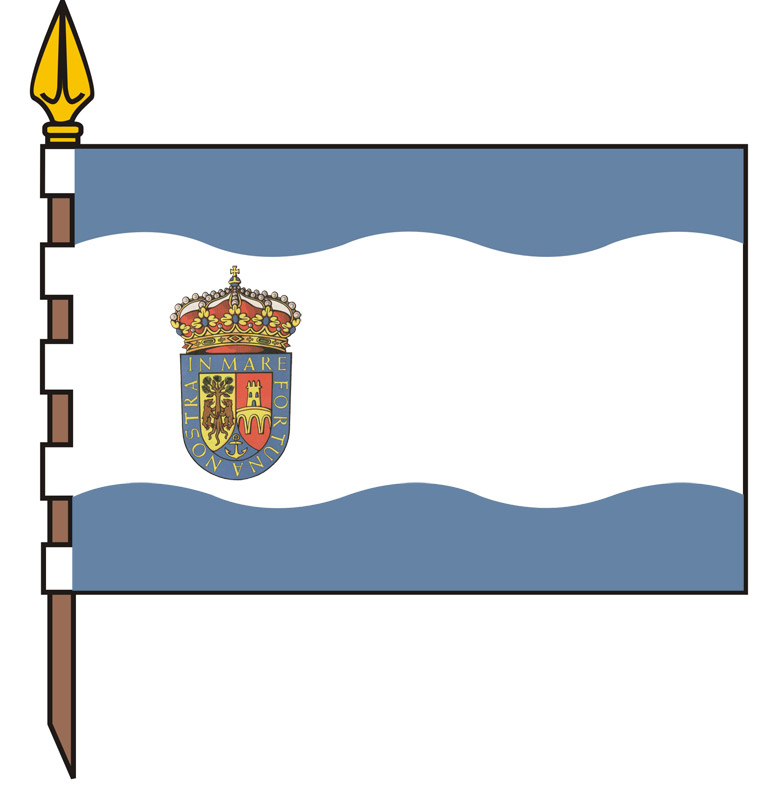 Rectangular, con dúas franxas de cor azul celeste onduladas e paralelas na súa parte central de 1/3 do ancho, deixando á vista dous cúspides e tres concavidades na súa parte superior e tres cúspides e dúas concavidades na inferior. Rectangular con dúas franxas de cor azul celeste onduladas e paralelas. Superposto levará o escudo da vila colocado a un terzo da súa lonxitude, partindo da hasta, ocupando a franxa branca ondulada de arriba abaixo.