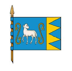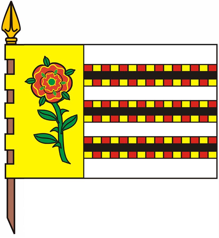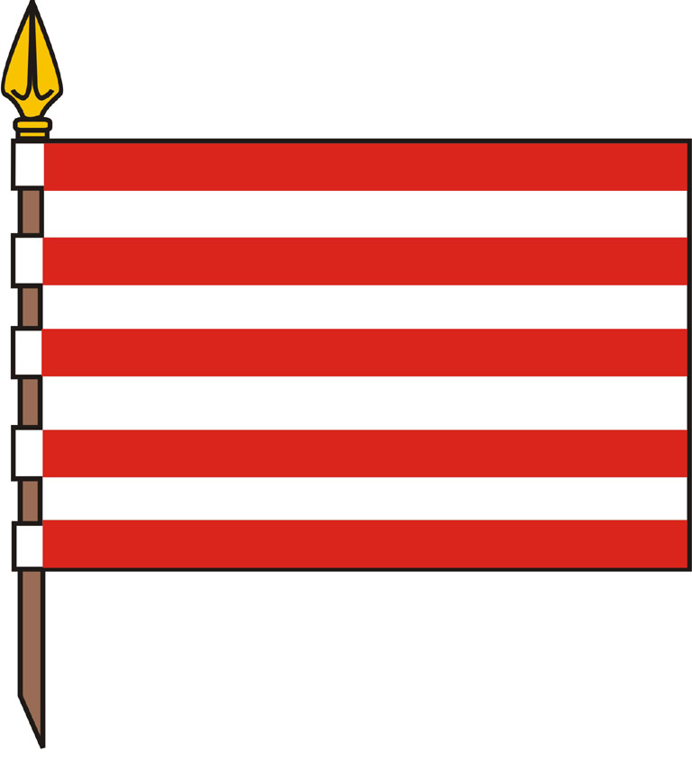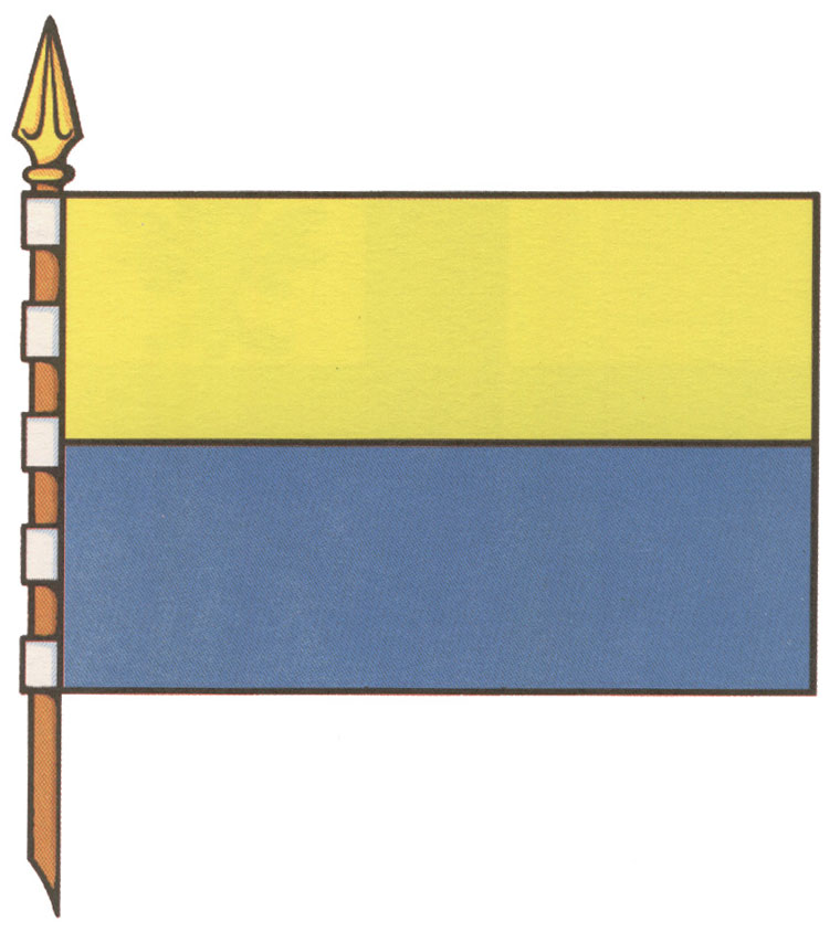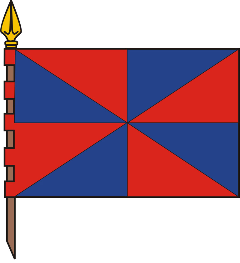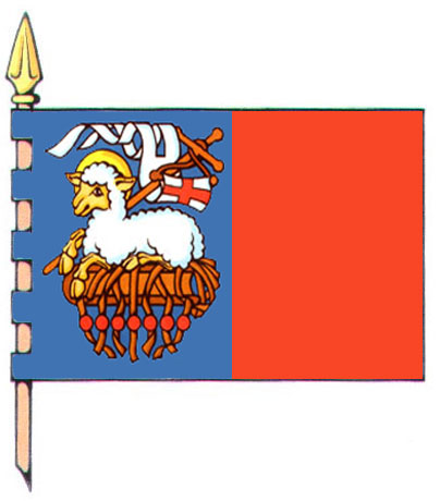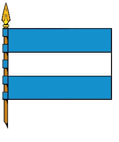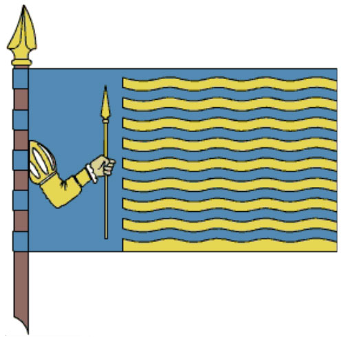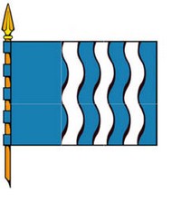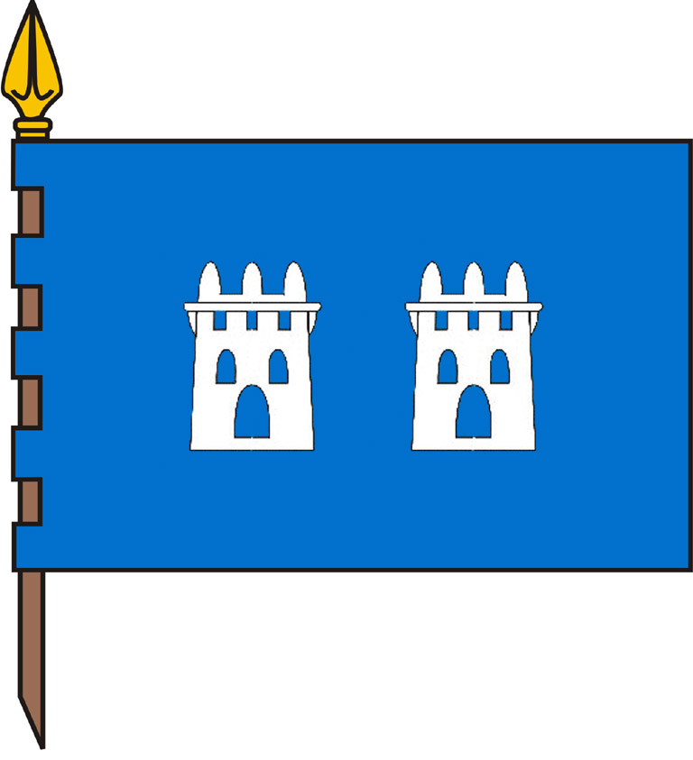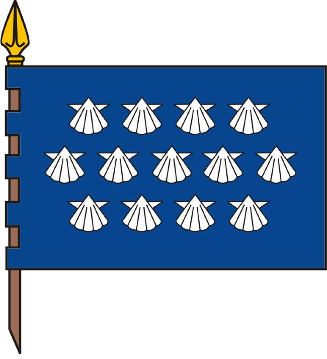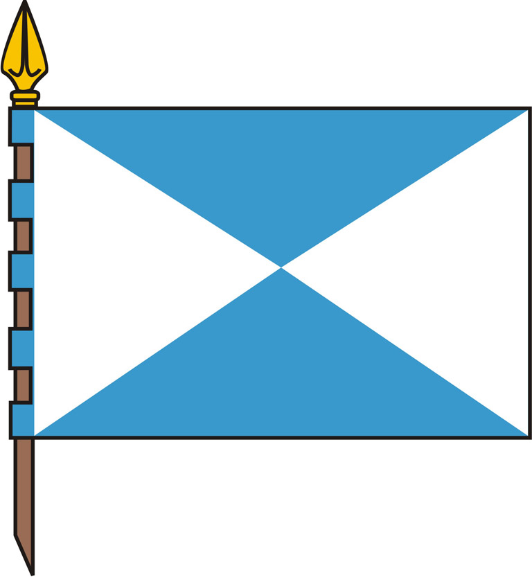 Rectangular, con dúas franxas de cor azul celeste onduladas e paralelas na súa parte central de 1/3 do ancho, deixando á vista dous cúspides e tres concavidades na súa parte superior e tres cúspides e dúas concavidades na inferior. Rectangular con dúas franxas de cor azul celeste onduladas e paralelas. Superposto levará o escudo da vila colocado a un terzo da súa lonxitude, partindo da hasta, ocupando a franxa branca ondulada de arriba abaixo.