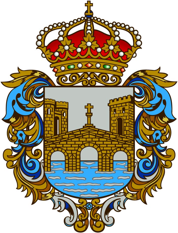 De azur (azul) e sobre ondas de azur e prata (branco), unha ponte alombada de tres ollos, sumado á destra dunha porta defendida por dúas torres ameadas, á sinistra dunha muralla ameada, movinte do flanco e adestrada de torre-porta, tamén ameada, e no centro dunha cruz latina e piñonada, o todo de ouro (amarelo) e aclarado de goles (vermello). Ao timbre, coroa real.
