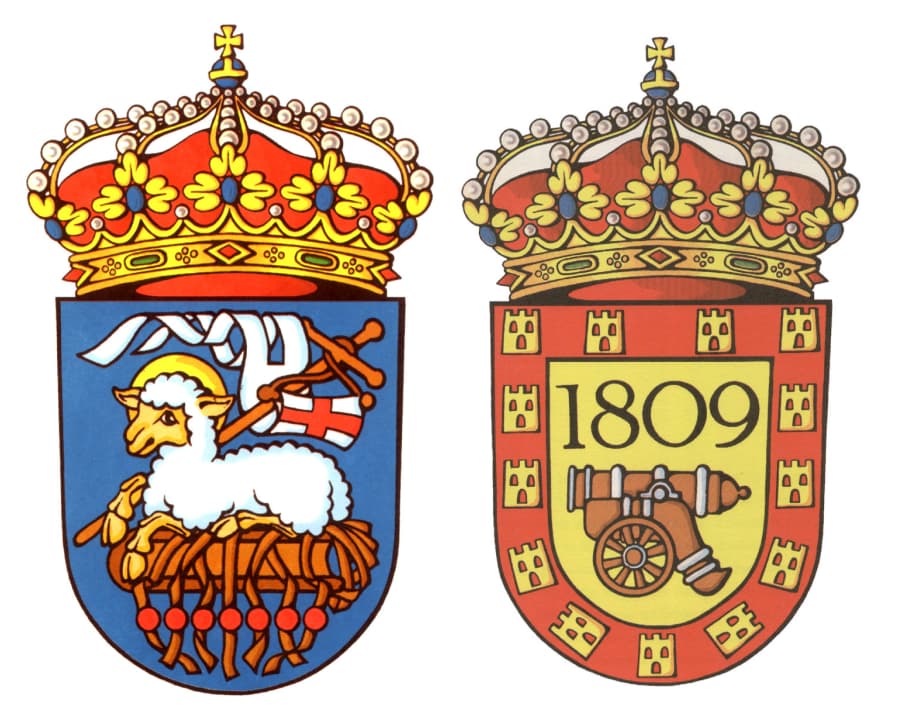 O pano azul e o canón amarelo, coa súa coroa e as rodas brancas, e enriba dous sabres de cabalería brancos, gornecidos de amarelo e dispostos en aspa. Terzada de vermello, na hasta, cos trece besantes amarelos (Sarmiento), e de amarelo, no batente, coas cuñas azuis (Acuña).