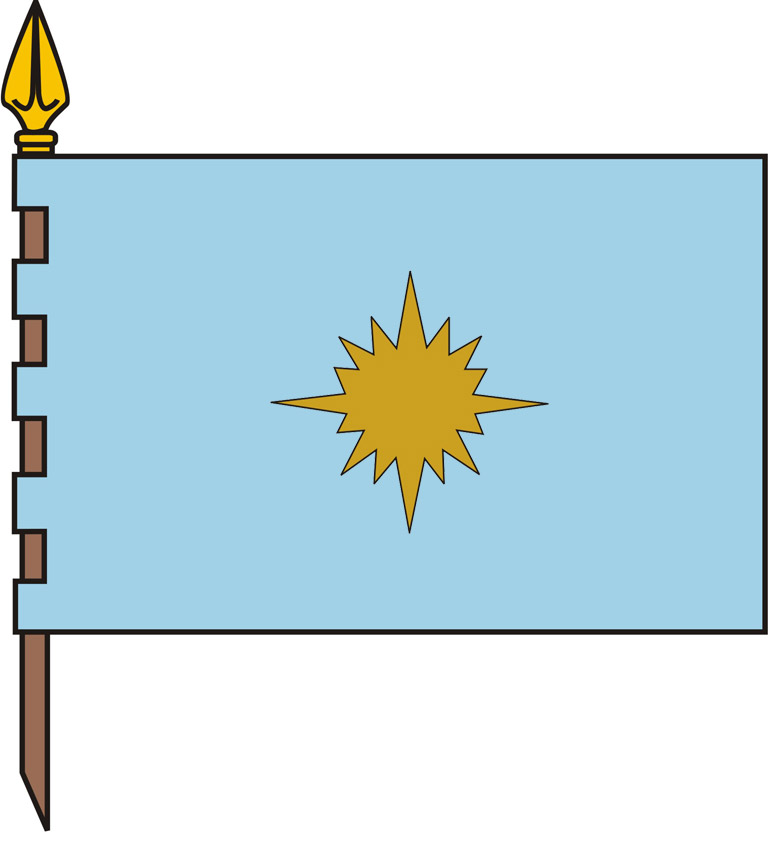 En fondo branco satinado, co escudo no centro, rodeado de trinta e tres estrelas en azur, distribuídas circularmente, formando nove tríades, coroadas de catro en liña e dúas centrais agrupadas.