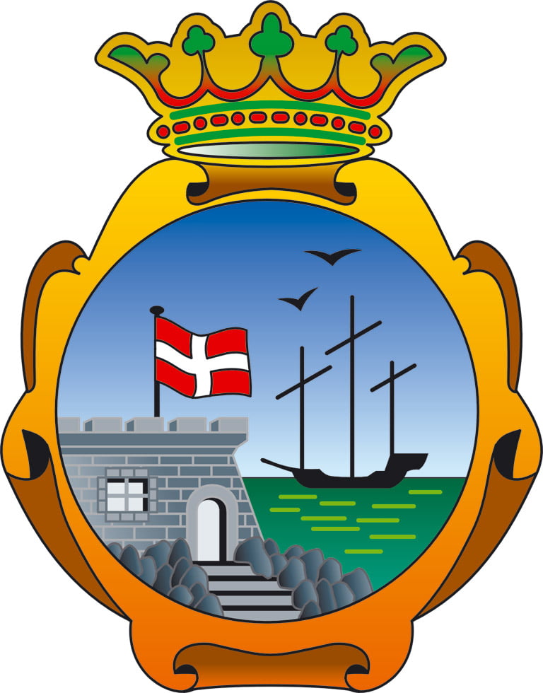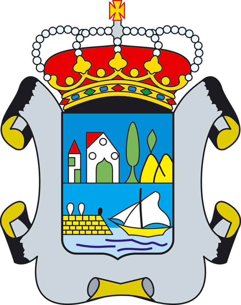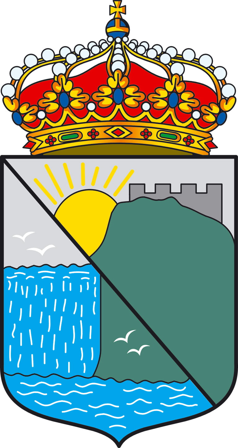 En campo de azur, movente do flanco destro unha fortaleza da súa cor, mazonada, sobre rochas e con escaleira de acceso, aclarada de prata e sumada de bandeira de goles cargada cunha cruz de prata; sinistrado todo dun bergantín de sabre de tres paus, sobre sinople, superado por dúas gaivotas de sabre. Ao timbre, coroa real pechada.
