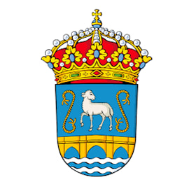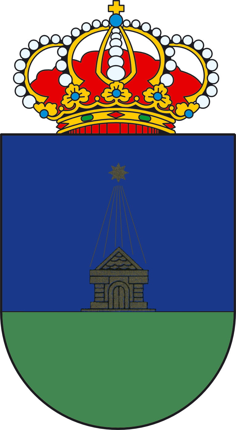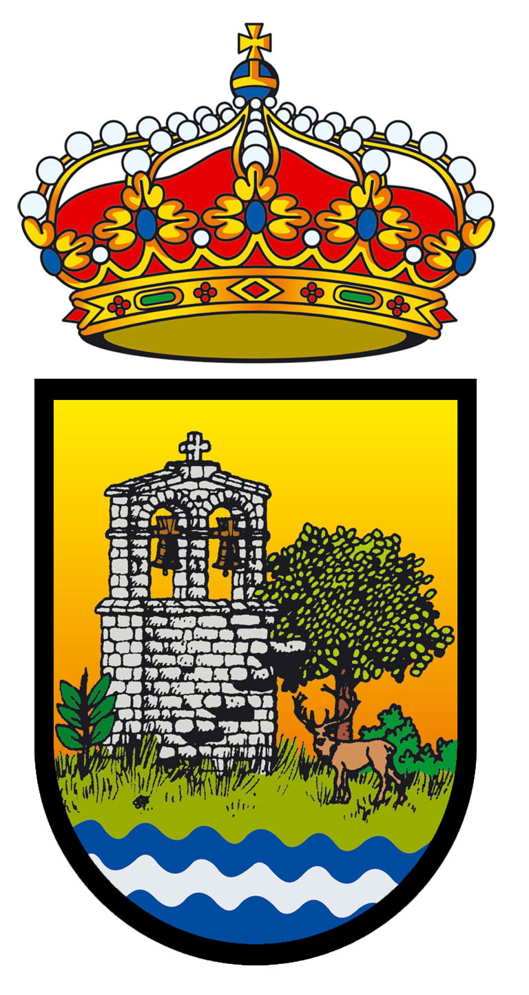 En campo de azur, unha montaña de ouro de tres cumes, en terraza de sinople con dúas faixas ondadas de prata; superada de dúas espigas de centeo de ouro en aspa e unha roca alta de prata no centro, acompañadas dun fuso alto a cada lado; bordura de sinople cargada de trece abellas de ouro; ao timbre, coroa real pechada.