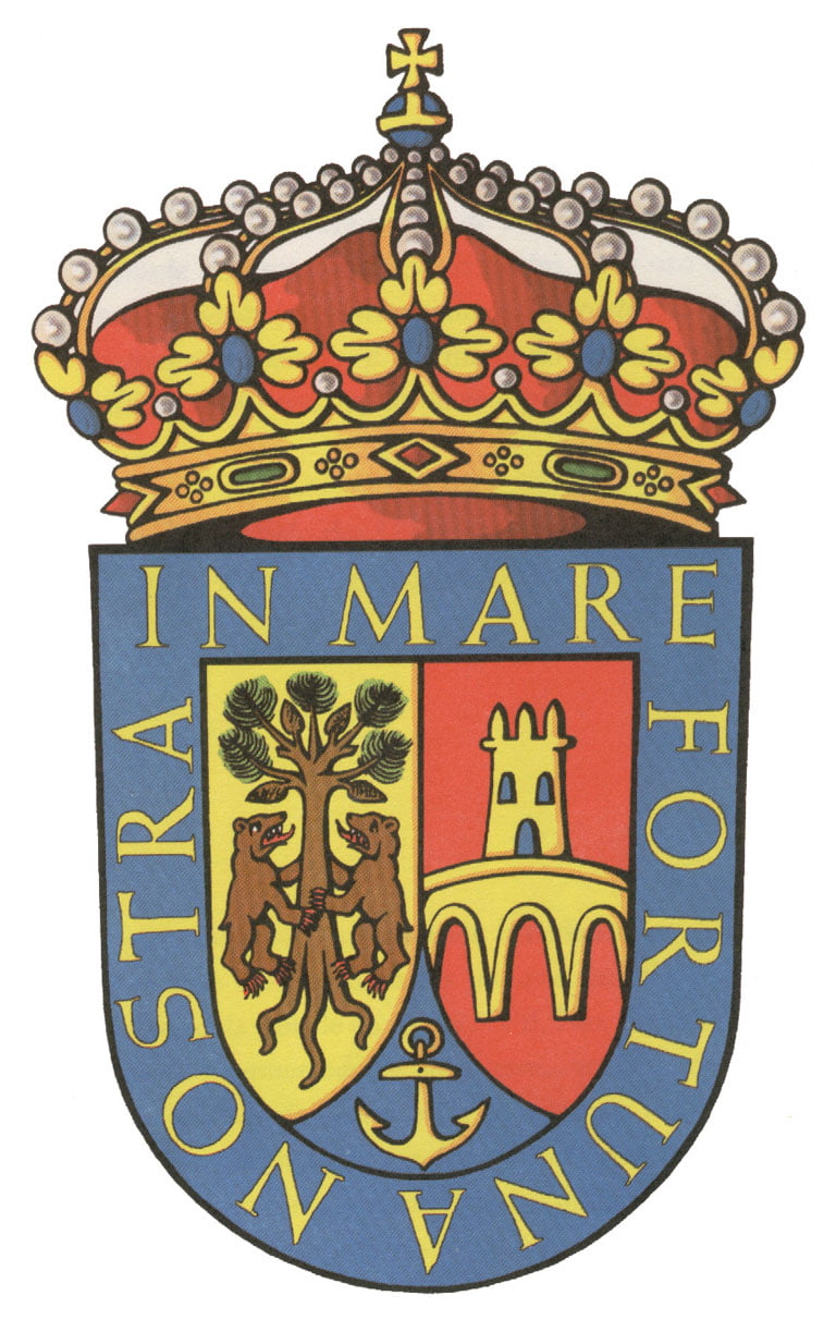 Partido. Primeiro: de ouro (amarelo), piñeiro arrincado da súa cor con dous osos do mesmo deitados ao tronco; segundo: de goles (vermello), ponte defendida de ouro; entado en punta de azur (azul), coa áncora de ouro. Bordura xeral de azur coa lenda “In mare fortuna nostra” en letras de ouro. Ao timbre, coroa real pechada.