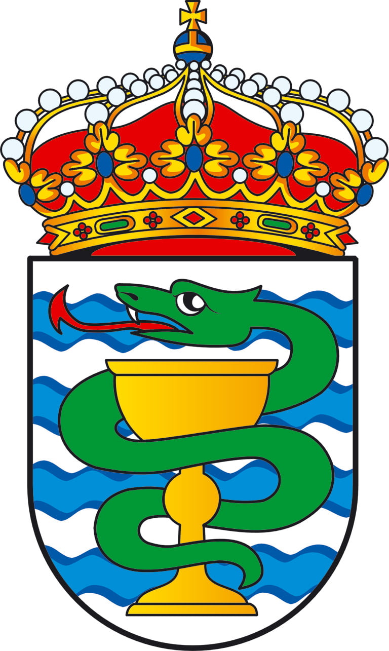 De prata (branco), catro faixas ondadas de azur (azul) e brochante sobre o todo unha copa de ouro (amarelo) coa serpe enroscada de sinople (verde) e linguada de goles (vermello). Ao timbre, coroa real pechada.
