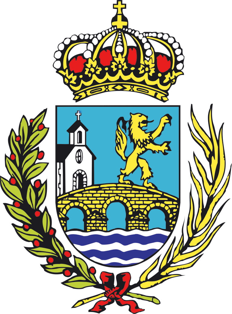 De sinople (verde) e sobre onda de prata (branco), unha ponte de cinco ollos de ouro (amarelo), surmontada dunha torre, oca e tamén de ouro, e nos francos dúas vieiras de prata, surmontadas, pola súa vez, da súa respectiva estrela de ouro. Ao timbre, coroa real pechada.