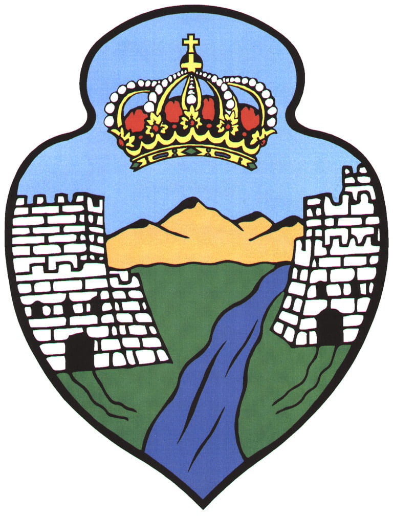 En campo de azur, unha porta de muralla, defendida por dúas torres de prata; a bordura compóñena dezaseis pezas, oito de ouro e oito de goles, cargadas estas de tres faixas de prata. Ao timbre, coroa real pechada.