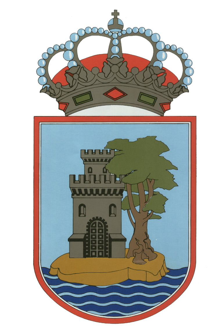 En campo azul claro, un castelo de base cadrada rematado nunha torre ameada, todo en ouro; na parte baixa unha porta con arco de medio punto, dúas fiestras cadrilongas no corpo medio e dúas troneiras, tamén cuadrilongas, na torreta. Cinxindo, en parte, o castelo, pola súa banda esquerda unha oliveira de sinople con tronco en marrón. Todo nun cotarelo en siena, sobre un mar de seis franxas ondeadas de azur mariño. A bordura en goles, separada por unha pequena cinta branca. Ao timbre, coroa real pechada.