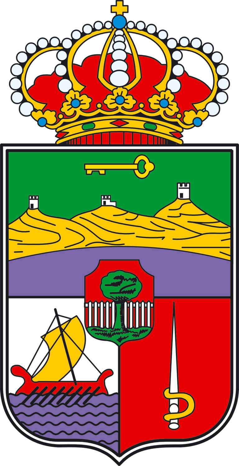 Cortado e medio partido, en tres cuarteis; na parte superior, o primeiro, en campo de sinople, tres castros fortificados, da súa cor, bañados polo mar en azur e coroados cunha chave de ouro; na parte inferior, a dereita, o segundo, en campo de prata, unha trirremes con vela, da súa cor, de ouro; a esquerda unha espada de prata en campo de goles; un escusón, tamén de goles, cun piñeiro de sinople, gretado de ouro, con cinco lanzas a cada lado, as hastas de prata e os ferros de ouro. Ao timbre, coroa real pechada.