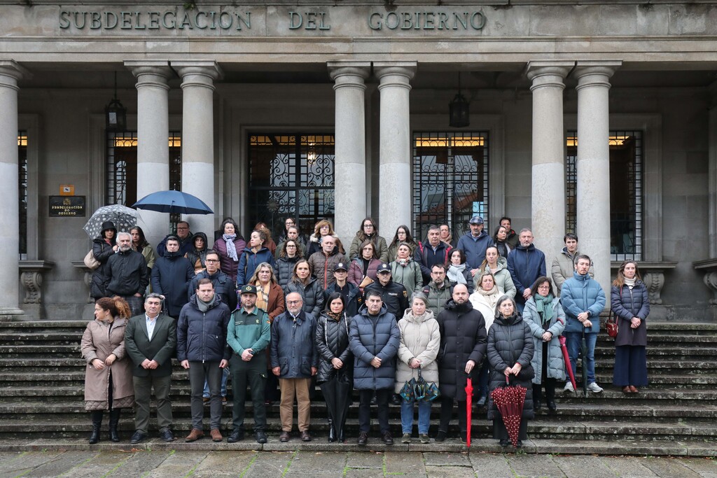 A deputada de Igualdade da Deputación de Pontevedra, Paula Bouzós, acompañada por membros do goberno provincial, asistiu este luns na Subdelegación do Goberno en Pontevedra ao minuto de silencio convocado en sinal de rexeitamento ao asasinato de M.B.F., de 52 anos, a mans da súa exparella onte no concello de Mos.