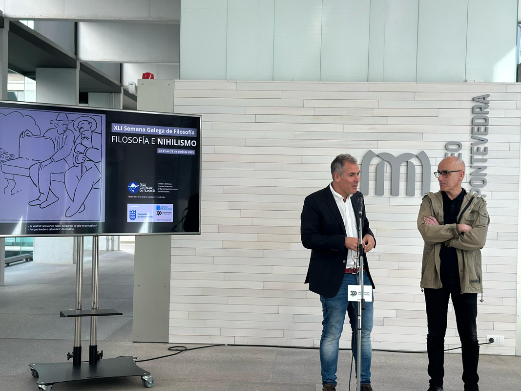 O vicepresidente da Deputación de Pontevedra, Rafa Domínguez, asistiu esta mañá á presentación da XLI Semana Galega de Filosofía á que enxalzou como “peza clave para situar a Pontevedra como epicentro do pensamento internacional”. Esta iniciativa, promovida pola Aula Castelao de Filosofía, que este ano reflexionará sobre “Filosofía e nihilismo” e se desenvolverá entre o 21 e o 25 de abril no Teatro Principal de Pontevedra, conta coa colaboración do organismo provincial e traerá ata Pontevedra a persoas das letras e grandes voces da filosofía como Néstor Boris Kohan, Marta Dacosta, Nuria Romo, Paula Chizane, Leo Espluga, Laura Martín, SamiAshour ou Márcia Tiburi.