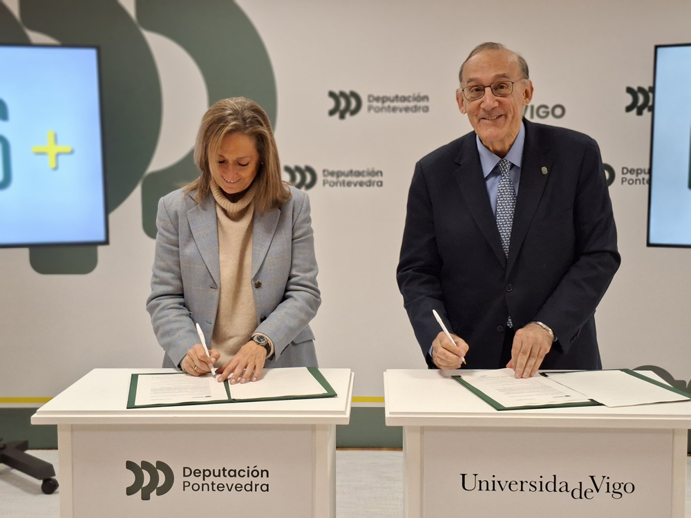 A vicepresidenta da Deputación de Pontevedra, Luisa Sánchez, e o rector da Universidade de Vigo, Manuel Reigosa, asinaron este luns o convenio bilateral mediante o cal a institución provincial destinará 100.000 euros á concesión de axudas complementarias a estudantes que participen nos programas de intercambio internacionais Erasmus+ Estudos e outros programas de intercambio con países extra-comunitarios.