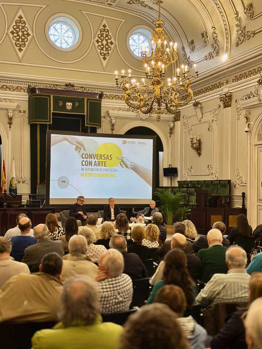 O vicepresidente da Deputación de Pontevedra, Rafa Domínguez, presentou no Salón de Plenos do Pazo provincial a quinta das conferencias do ciclo “Conversas con arte”, que foi protagonizada polo artista pontevedrés Alberto Barreiro. Rafa Domínguez subliñou que o obxectivo deste ciclo, que arrancou a súa segunda edición coa conferencia de Barreiro, é “achegar á cidadanía as grandes figuras da cultura galega, apoiar, impulsar e promocionar o renacemento cultural que está a vivir Galicia e servir como tribuna de análise de cuestións de actualidade”. Neste eido, o vicepresidente provincial convidou a reflexionar sobre a Intelixencia Artificial e a súa relación coa arte a través dos apuntamentos do artista pontevedrés.