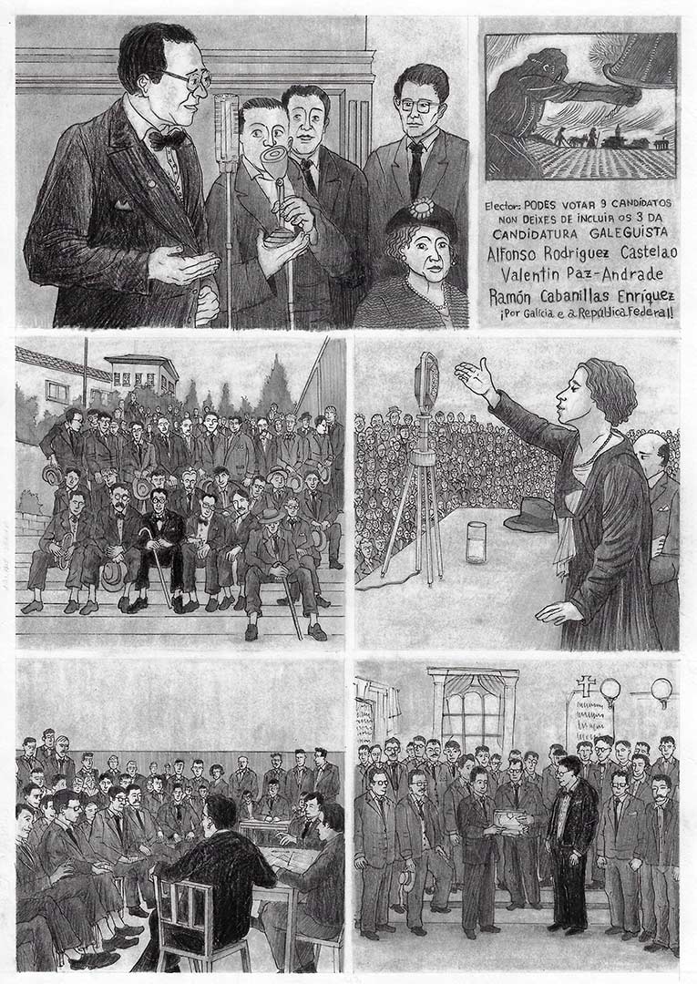 Nese período comprendido entre 1916 e 1936, o cómic recolle momentos clave da biografía de Castelao, como a súa intervención na Asemblea Nacionalista de Lugo (1918), a viaxe a Francia, Béxica e Alemaña (1921), a morte do seu fillo (1928), a edición do álbum ‘Nós’ (1931), o desterro en Badajoz (1934) ou os acontecementos de 1936, coa súa eleción como deputado pola Fronte Popular, a campaña e aprobación do Estatuto de Galicia e o alzamento militar que dá inicio á Guerra Civil e provoca o seu exilio.  O libro inclúe un rico rexistro visual no que as viñetas recrean minuciosamente obras de Castelao e usan como fonte moitas fotografías da súa vida e un amplo abano de imaxes de arquivo: paisaxes rurais, rúas e prazas, carteis e escenas da vida cotiá.