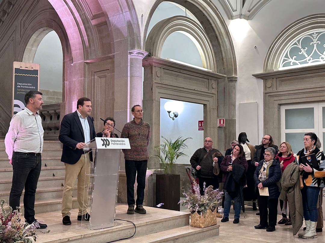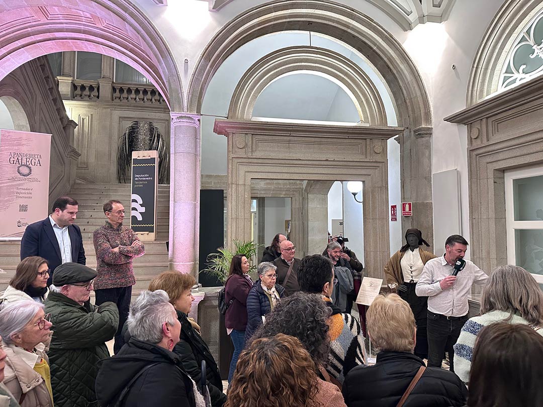 A Deputación de Pontevedra puxo este luns á disposición do público “A pandeireta galega. Actualización dun instrumento ancestral”, unha exposición itinerante do Consello da Cultura Galega que se poderá visitar ata o 27 de febreiro no vestíbulo principal do Pazo provincial. O deputado de Cultura, Jorge Cubela, participou nos actos de inauguración da mostra, nos que tamén estiveron presentes a presidenta do Consello da Cultura Galega, Rosario Álvarez, e os comisarios da exposición, Luciano Pérez Díaz e Suso Vaamonde Manteiga, e que contaron cunha sesión de relatorios.
