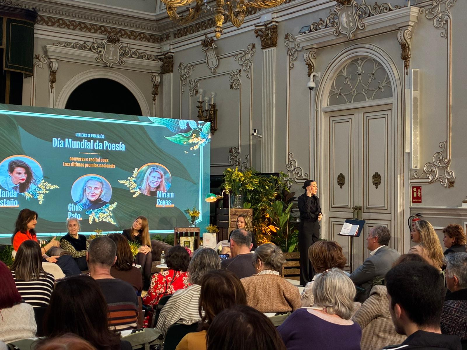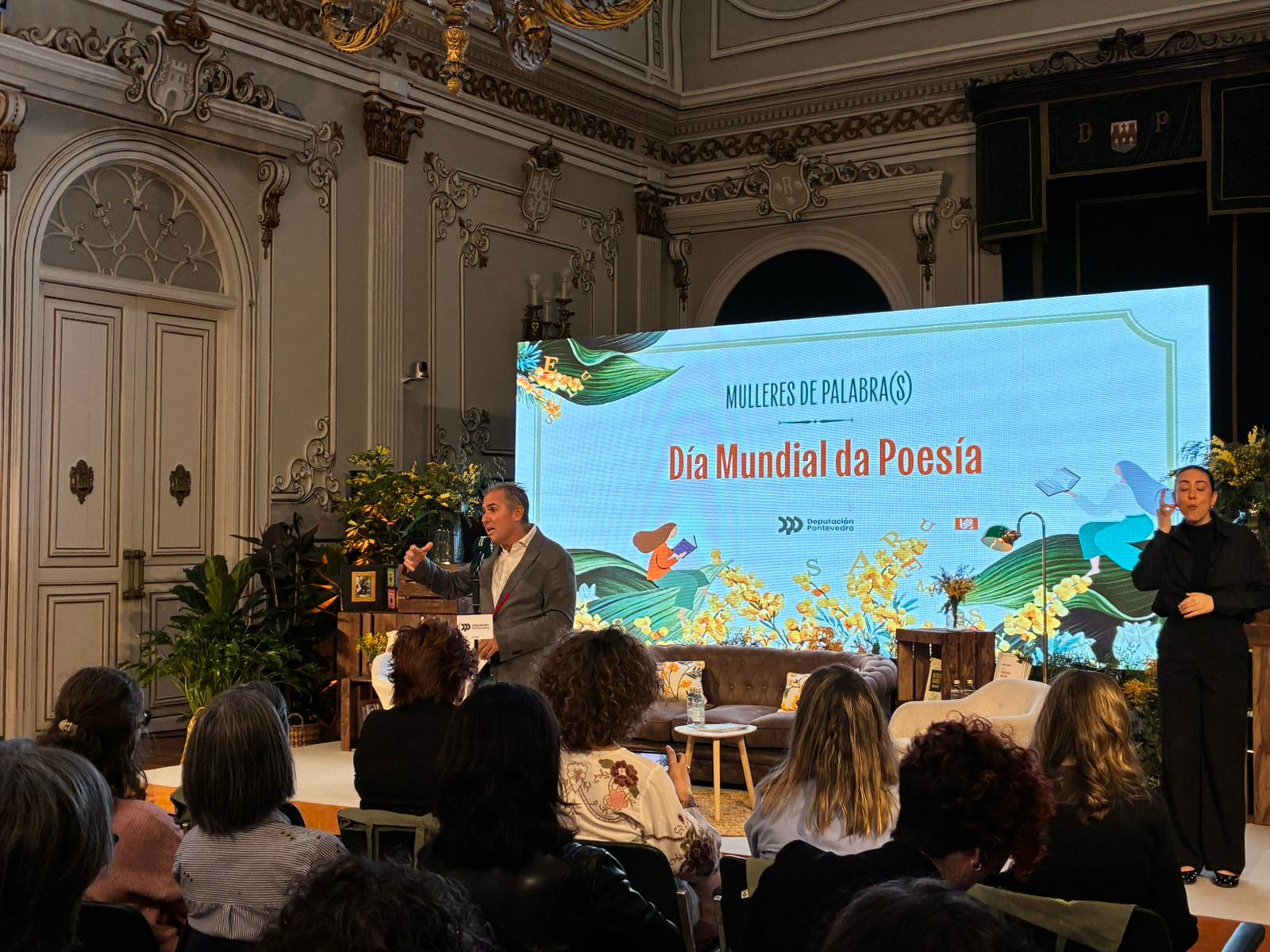 O vicepresidente da Deputación de Pontevedra, Rafa Domínguez, asistiu este sábado no Pazo provincial á primeira acción da segunda edición do programa Mulleres de palabra(s), unha iniciativa que busca reivindicar a palabra das mulleres escritoras do pasado e do presente, así como crear espazos compartidos nos que fomentar a lectura, descubrir voces femininas, a conversa, a escoita colectiva e a reflexión con perspectiva de xénero. A Deputación reuniu as últimas tres mulleres en recibir o Premio Nacional de Poesía, Miriam Reyes, Chus Pato e Yolanda Castaño, co gallo do Día Mundial da Poesía que se celebrou o pasado 21 de marzo, cunha conversa e recital dos seus poemas.