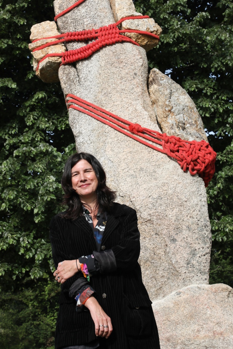 ‘El peso de la memoria’ é unha figura de pedra de máis de tres metros de altura que Idoia Cuesta pensou para a Illa das Esculturas. A súa forma lembra un corpo humano en tensión, coma se tentase avanzar, manterse erguido ou alzar a voz. Varias cordas de cor vermella, tecidas á man, envólveno por completo, inmobilizándoo. A obra constrúese desde unha relación directa co corpo e coa materia, e o xesto de trenzar, apertar ou suxeitar cárgase de sentido.