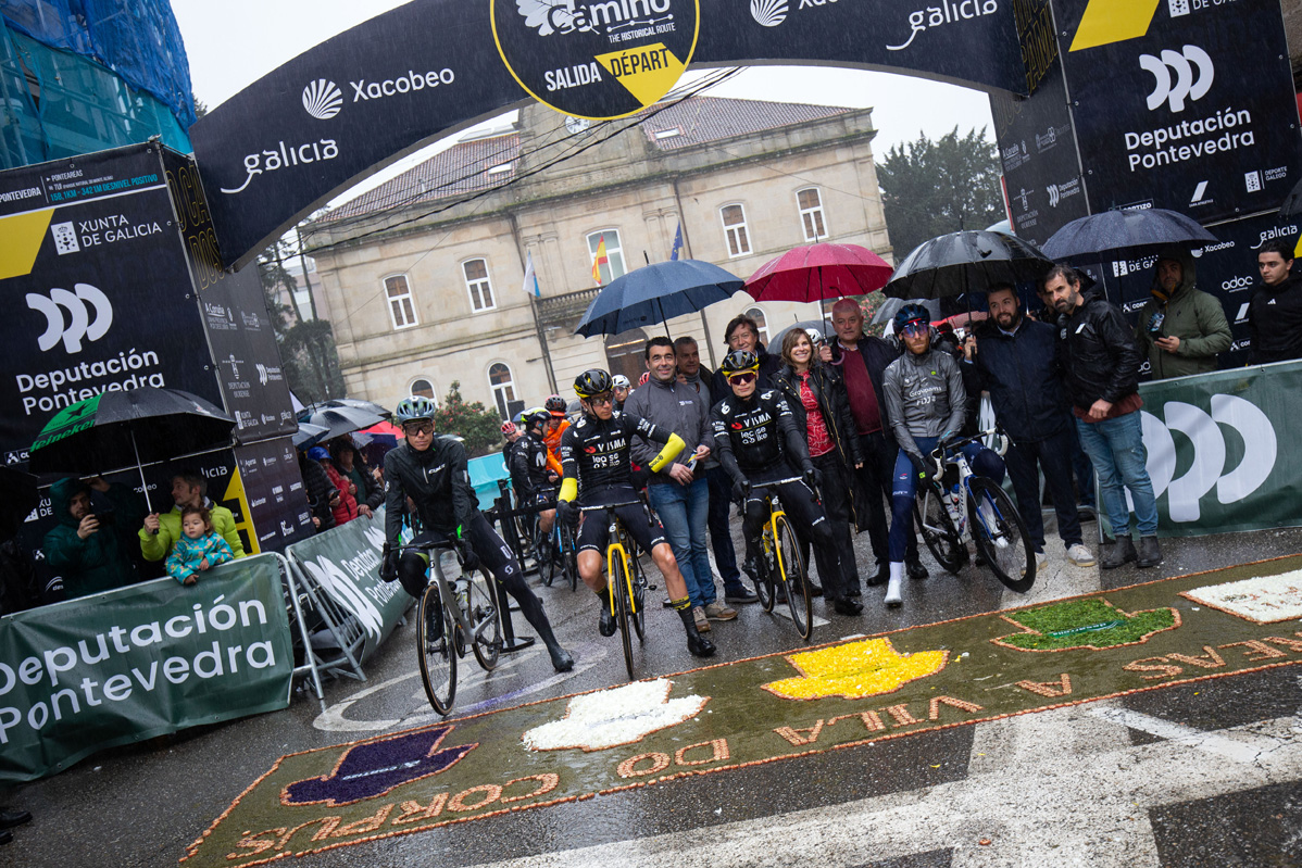 Luis López corta a cinta que lle dá inicio á etapa decisiva da proba ciclista O Gran Camiño entre Ponteareas e Tui