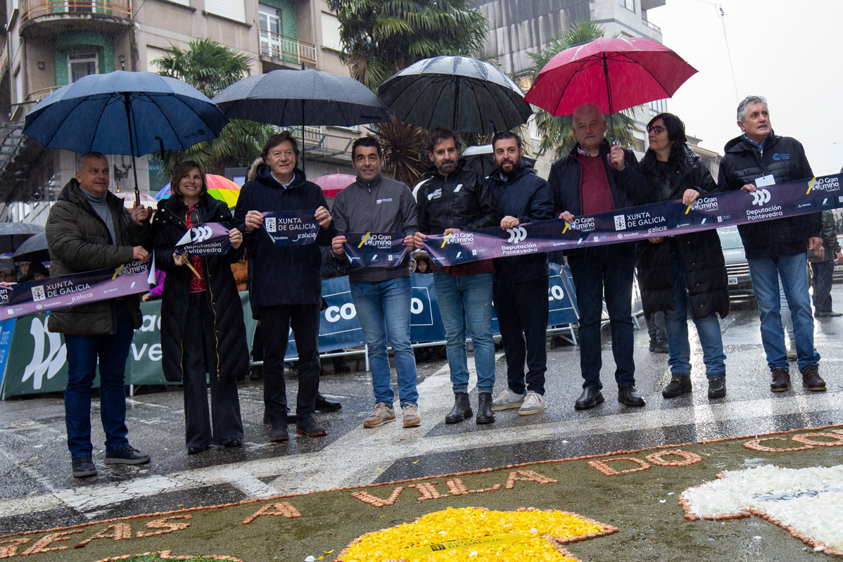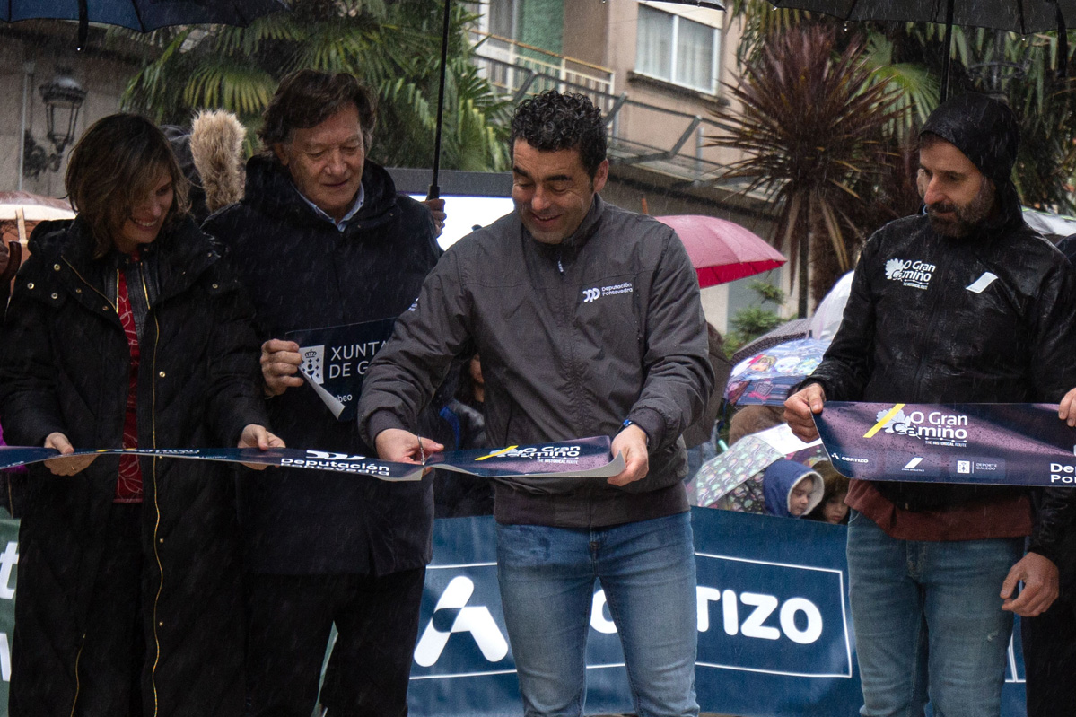 O presidente da Deputación de Pontevedra, Luis López, participou este domingo no protocolario acto de corte de cinta que lle deu inicio á cuarta e derradeira etapa da carreira ciclista O Gran Camiño, que comezou no centro de Ponteareas e rematou no alto do monte Aloia, en Tui. O mandatario provincial estivo acompañado pola alcaldesa de Ponteareas e deputada provincial de Turismo, Nava Castro; o secretario xeral para o Deporte, José Ramón Lete Lasa; e o organizador da competición, Ezequiel Mosquera.