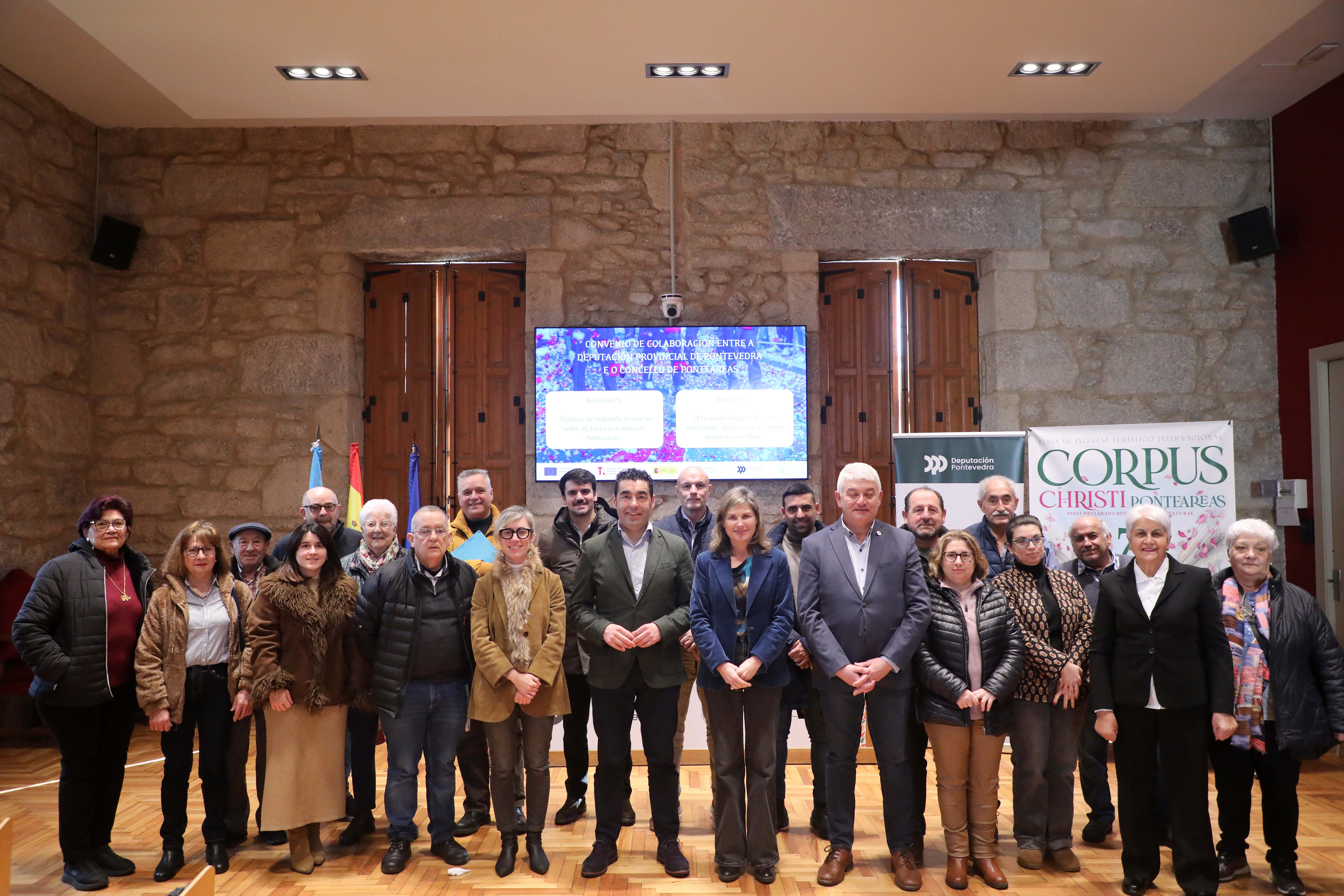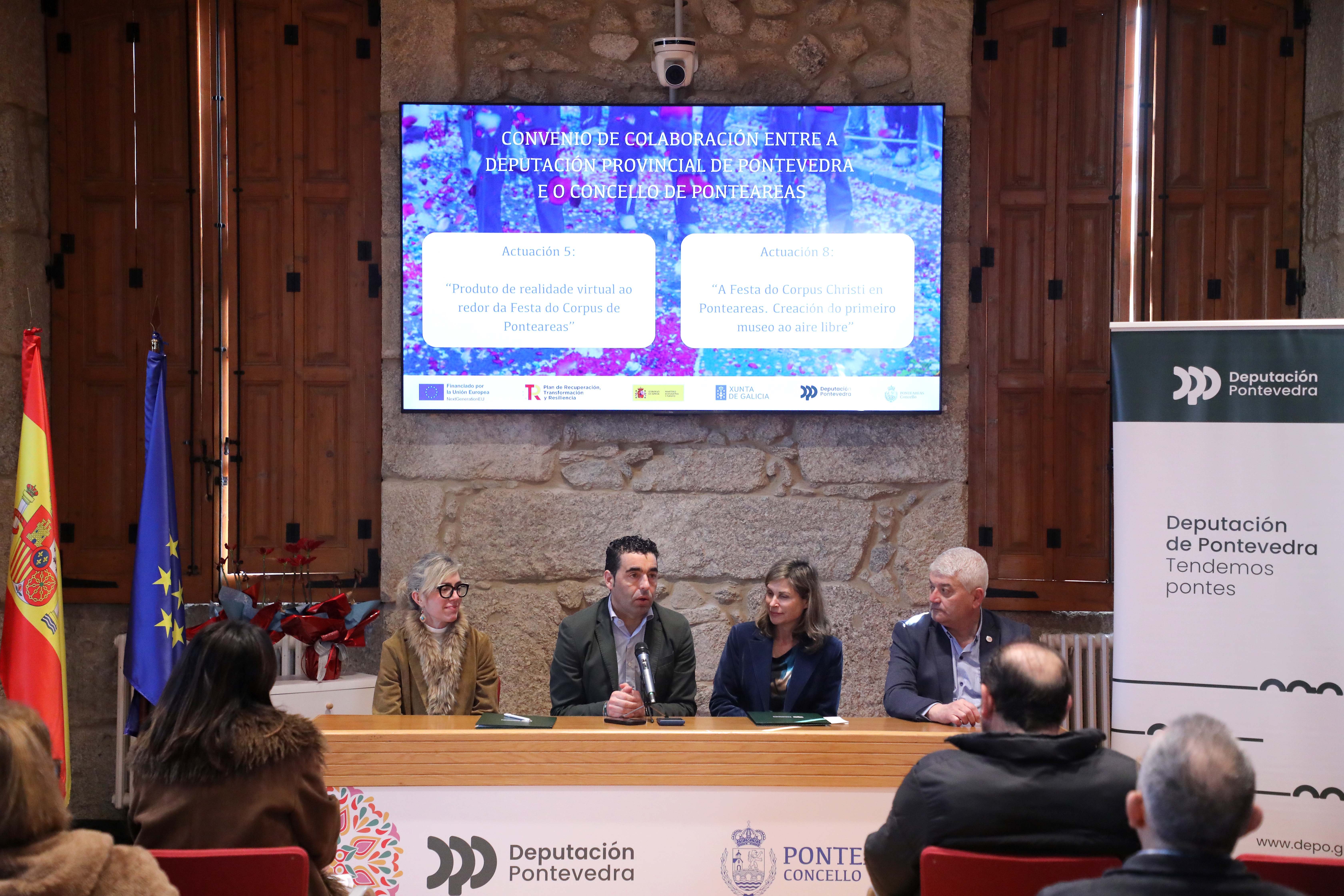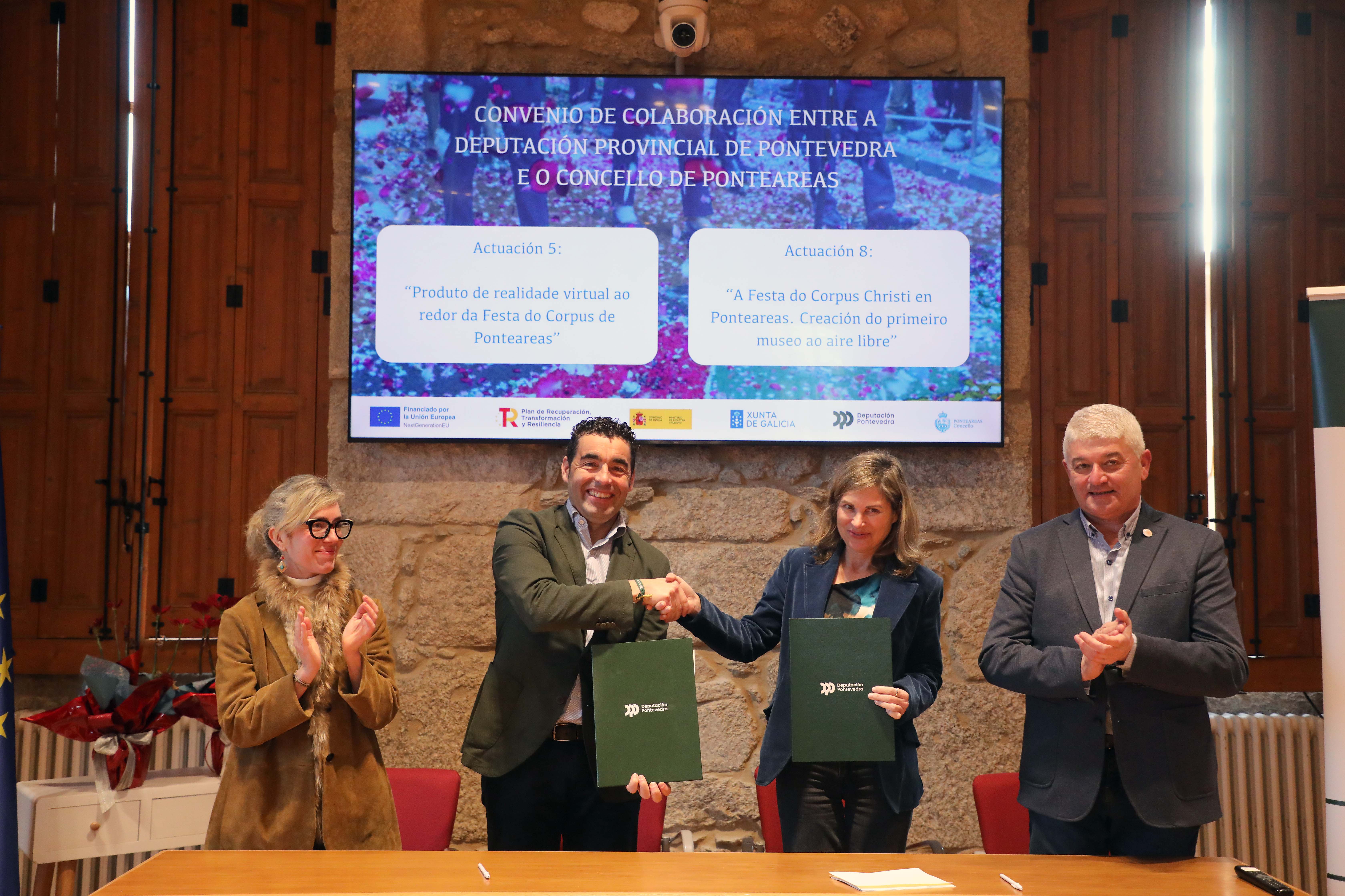 O presidente da Deputación de Pontevedra, Luis López, asina coa alcaldesa de Ponteareas, Nava Castro, dous convenios que consolidarán á festa do Corpus como unha referencia para a tradición, a cultura, o turismo e a innovación tanto na comarca do Condado e a Paradanta, como para o conxunto da provincia. Cun orzamento de preto de 170.000 euros achegados integramente polo organismo provincial, estes dous proxectos servirán para a creación dun museo ao aire libre centrado no Corpus no centro urbano de Ponteareas e para a creación dun produto virtual que permitirá vivir esta festa declarada de Interese Turístico Internacional durante todo o ano. “Imos poder sentir, vivir e desfrutar do Corpus os 365 días do ano”, afirmou o mandatario provincial, nun acto no que estivo presente a directora de Turismo da Deputación, Romina Fernández, membros da corporación municipal e representantes dos colectivos de alfombristas do Corpus de Ponteareas.